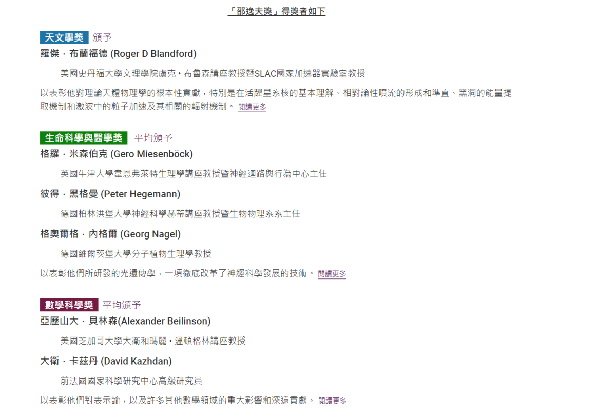 邵逸夫獎基金會今日(21日)公佈2020年度得獎名單,本屆生命科學與醫學獎平均分給三人,分別是英國牛津大學韋恩弗萊特生理學講座教授格羅.米森伯克 (Gero Miesenböck)、德國柏林洪堡大學神經科學赫蒂講座教授彼得.黑格曼 (Peter Hegemann),和德國維爾茨堡大學分子植物生理學教授格格奧爾格.內格爾 (Georg Nagel),以表彰他們研發出的光遺傳學。