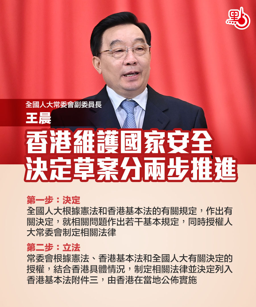 王晨表示,第一步是全國人大根據憲法和香港基本法的有關規定,作出有關決定,就相關問題作出若干基本規定,同時授權人大常委會制定相關法律;第二步是常委會根據憲法、香港基本法和全國人大有關決定的授權,結合香港具體情況,制定相關法律並決定列入香港基本法附件三,由香港在當地公佈實施。
