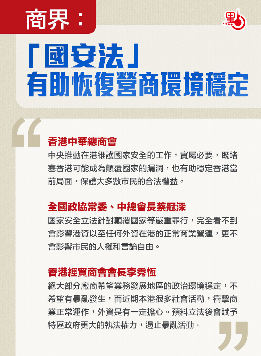 十三屆全國人大三次會議將審議《全國人民代表大會關於建立健全香港特別行政區維護國家安全的法律制度和執行機制的決定(草案)》,香港商界對草案表示支持,認為有助遏制暴力示威活動,令香港營商環境恢復穩定。