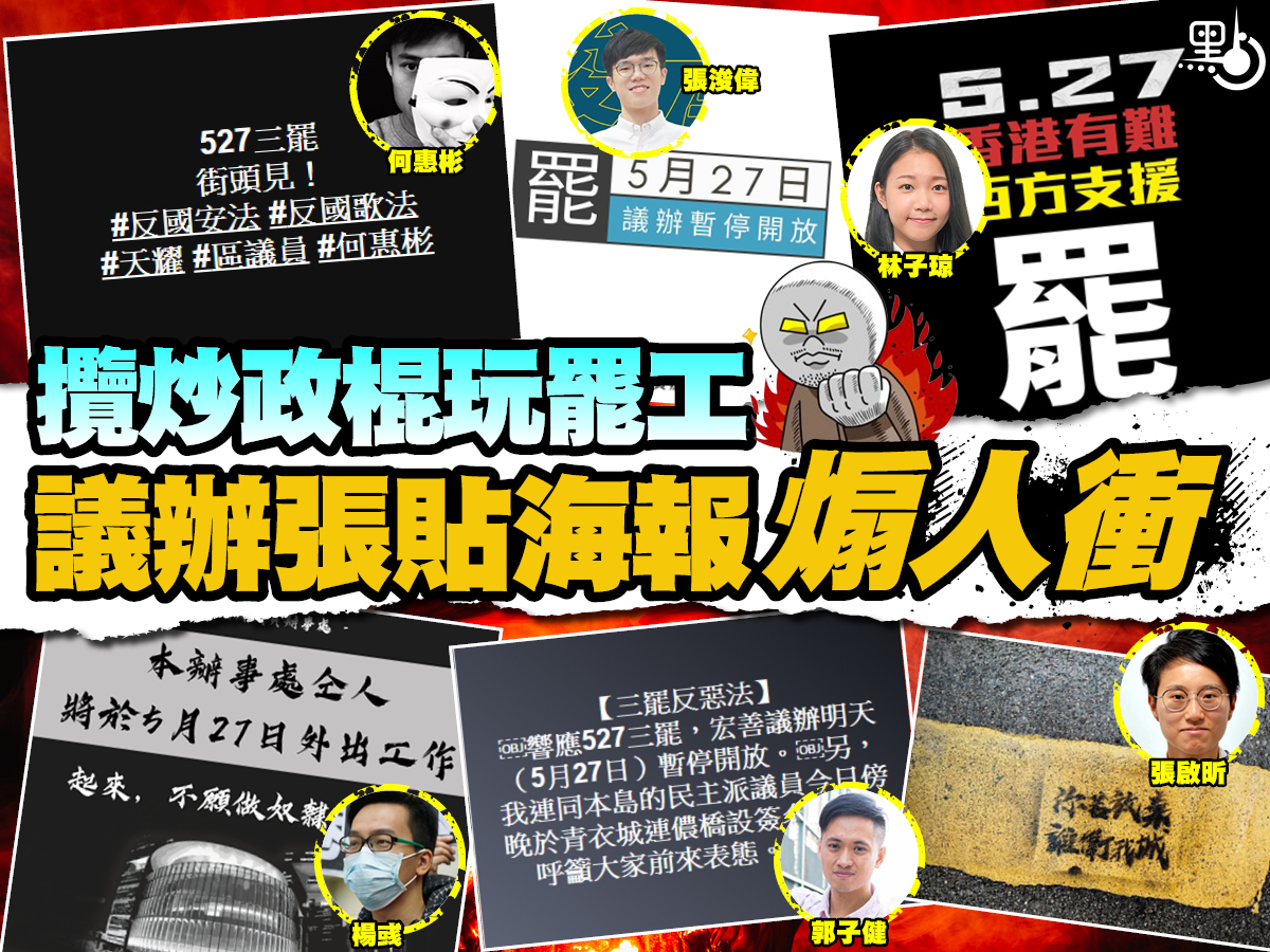 煽暴文宣連日在網上吹雞發起所謂「三罷」,煽動今日包圍立法會,阻止二讀審議《國歌法》。有激進分子更狂言「衝入警署搶軍火」,「民主派會議」召集人陳淑莊昨日亦聲言,將「義無反顧」反對《國歌法》。多個攬炒派區議員,包括公民黨各辦事處,以及楊彧、郭子健、劉珈汶、何惠彬、張浚偉、曾健成、張啟昕、林子琼等的區議員辦事處聲言會「罷工」,更在其辦事處甚至該區的房屋署告示板上張貼寫有「527,反『惡』歌法,全民三罷」等的煽動性宣傳海報。民主黨則聲稱該黨各辦事處會「因應情況開放」。