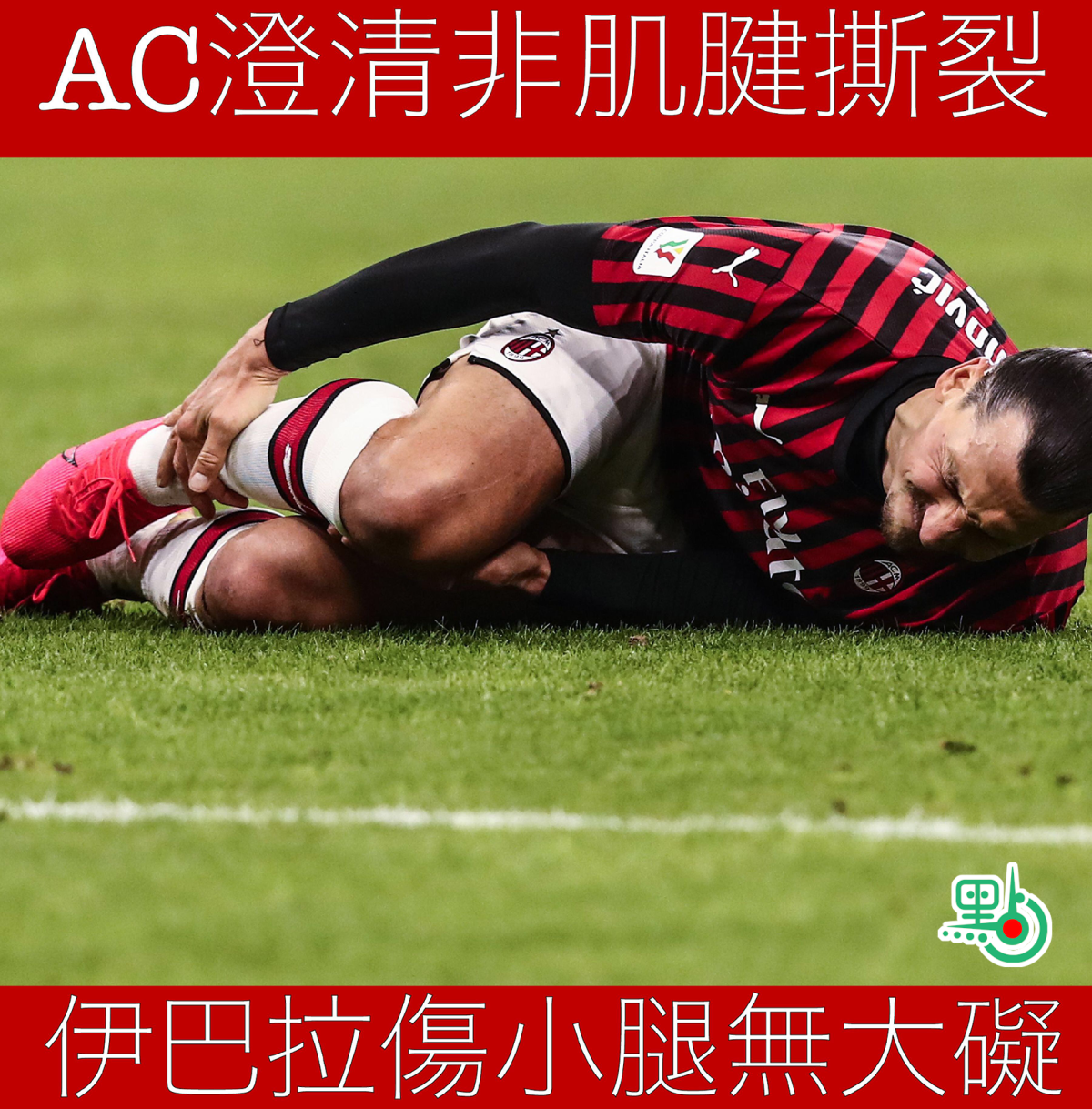 AC米蘭發出聲明,澄清旗下38歲瑞典鋒霸伊巴謙莫域只是在操練中拉傷小腿,並非早前傳出的肌腱撕裂。早前傳出伊巴在操練時嚴重受傷,甚至有可能就此收山,但現在看來情況並非太壞。