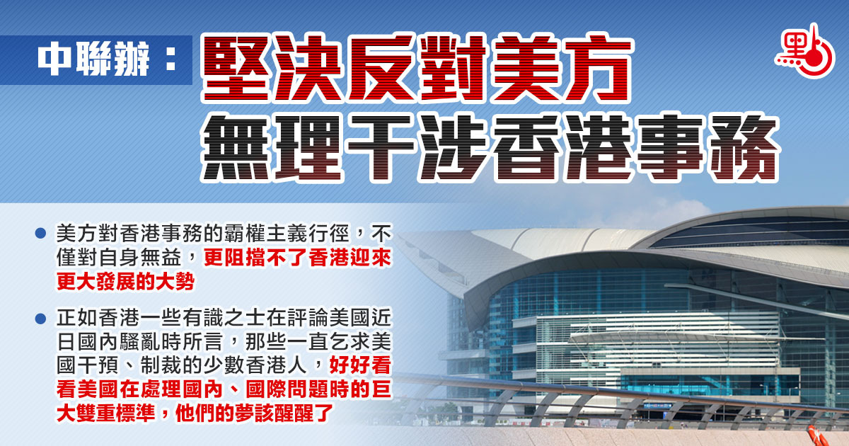 發言人指出,維護國家安全是世界上所有主權國家的正當行為,香港國安立法完全是中國內政,任何外國無權干涉。美國在自己的國家安全立法無所不及,密不透風,卻對中國修補香港維護國家安全的法律漏洞橫加指責,甚至以制裁相威脅,真是豈有此理!美方無視現代國際法基本原則和國際關係基本準則,長期對香港事務粗暴干涉,充分暴露了其國際霸權主義的一貫嘴臉,中聯辦對此強烈譴責和堅決反對。