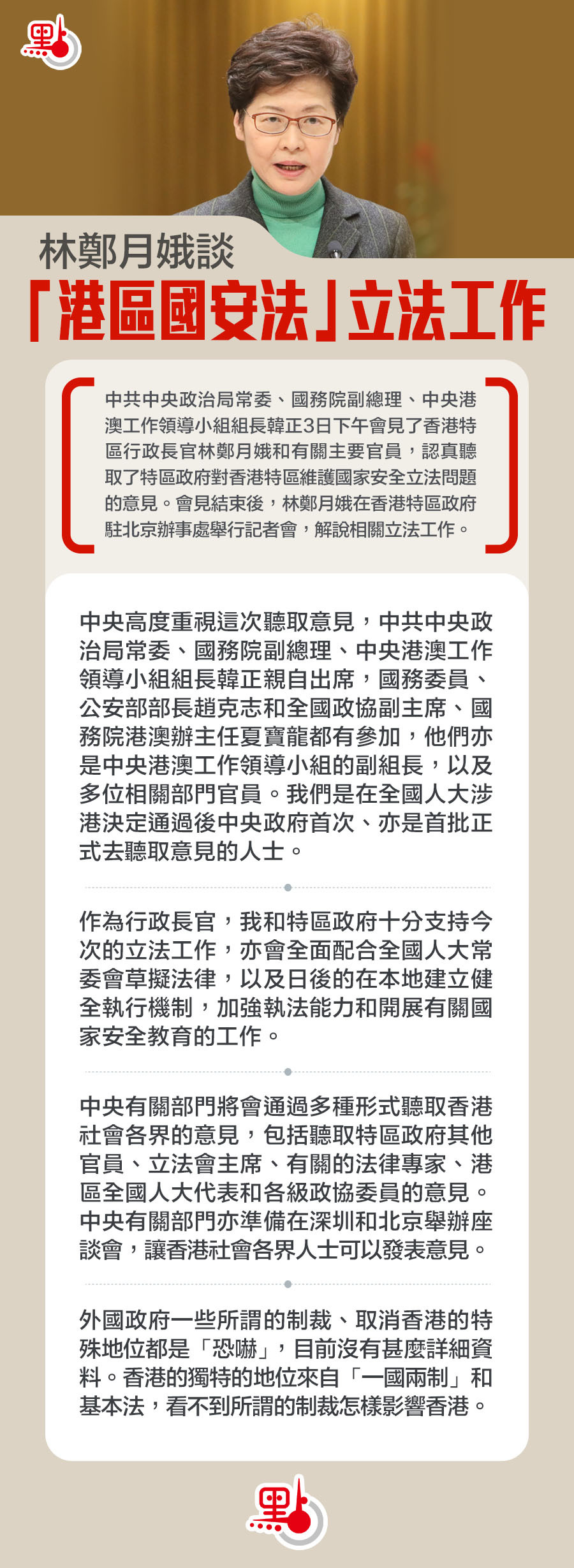 中共中央政治局常委、國務院副總理、中央港澳工作領導小組組長韓正3日下午會見了香港特區行政長官林鄭月娥和有關主要官員,認真聽取了特區政府對香港特區維護國家安全立法問題的意見。會見結束後,林鄭月娥在香港特區政府駐北京辦事處舉行記者會,解說相關立法工作。