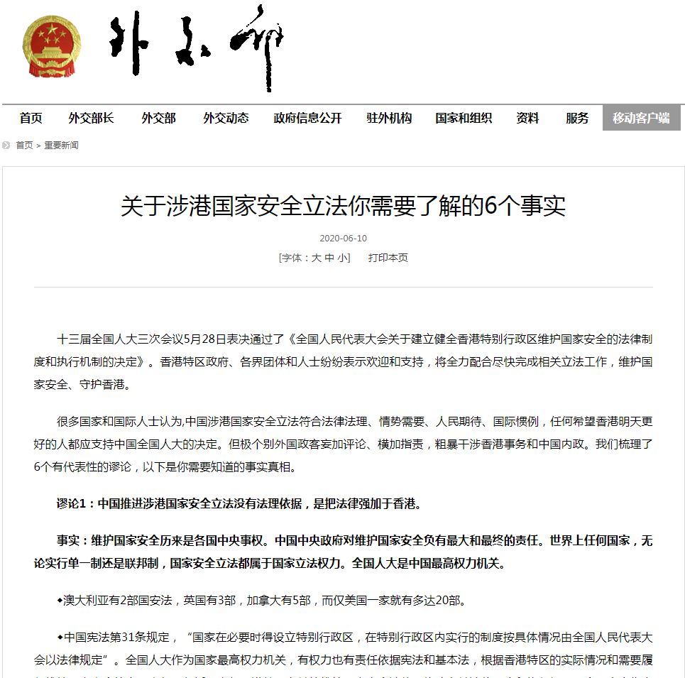 全國人大5月28日通過有關「港區國安法」的決定。外交部今日(10日)在網站發表文章,指外界對「港區國安法」有6個代表性謬論,並逐點反駁。當中有人認為中國推進「港區國安法」無法理依據,是把法律強加於香港,外交部強調,中央政府對維護國家安全負有最終責任,過去一段時間,香港危害國安的活動愈演愈烈,特別是去年修例風波以來,「港獨」和激進分離勢力活動日益猖獗,外部干預勢力加強干預香港事務,必須採取有力措施依法予以防範、制止和懲治。