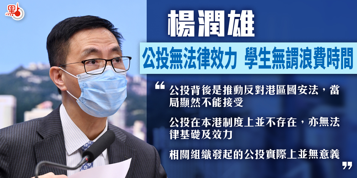 楊潤雄指,罷課公投不是分裂國家行為,但公投背後是推動反對「港區國安法」,當局顯然不能接受,公投在本港制度上並不存在,亦無法律基礎及效力,相關組織發起的公投實際上並無意義,呼籲學生勿浪費無謂時間。