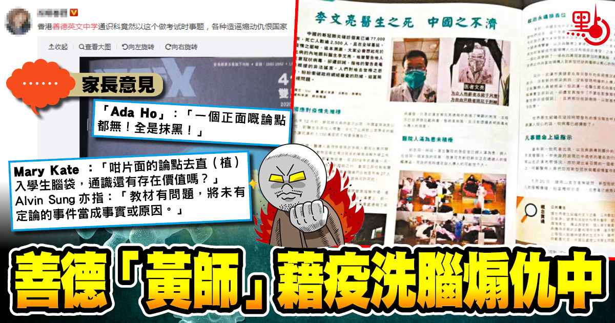 通識科教材「無王管」!有家長群組近日爆料,指位於葵涌的佛教善德英文中學有通識科教師以新冠肺炎疫情作考題,但只選取一面倒抨擊中國內地的負面文章作參考資料,要求學生購買閱讀,備試通識科時事題。家長批評疫情至今尚未定案,不應教學生妄下定論,質疑質疑該教師別有用心,刻意採用抹黑中國內地的問題「教材」,灌輸學生仇中思想,表明會向教育局投訴。教育局表示已要求涉事學校提交報告,並會嚴肅跟進事件。涉事「教材」被指出自一份報章,其中有文章提及所謂「中國未能及早控制疫情的三大原因」,一面倒將疫情爆發歸咎中國內地,忽視新冠肺炎疫情爆發的其他客觀原因,也對中國內地一直及時發布疫情資訊、積極與國際抗擊疫情等正面訊息隻字不提。無懼打壓 繼續發聲 歡迎到 Apple/Google play store 下載 「點新聞」app 或直接進入點新聞網站瀏覽最新最準的新聞資訊:www.dotdotnews.com使用其他社交媒體訂閱點新聞YouTube: youtube.com/c/dotdotnews點新聞Telegram: t.me/dotdotnewsInstagram: instagram.com/dotdotnews