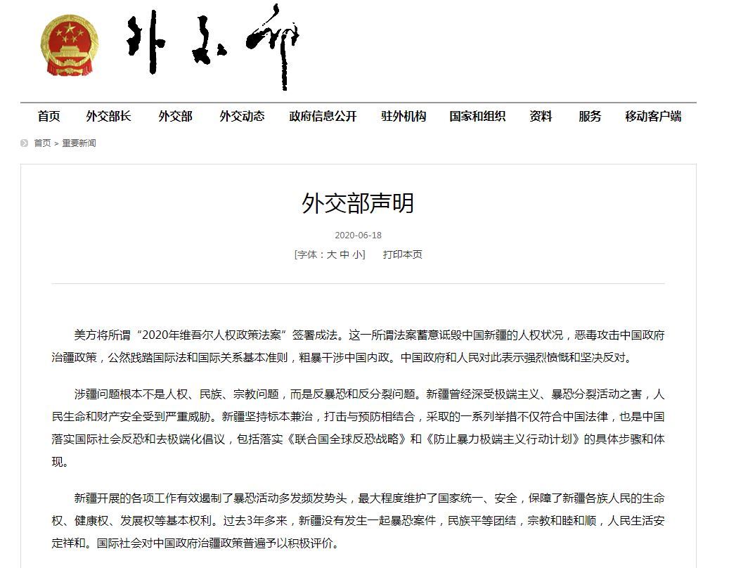 美國總統特朗普簽署國會所謂的「維吾爾人權政策法案」。中國外交部今日(18日)發表聲明,批評有關法案蓄意詆毀中國新疆的人權狀況,對此表示強烈憤慨和堅決反對。外交部說,美方法案罔顧事實、顛倒是非,認為美方在反恐問題上赤裸裸地搞雙重標準,進一步暴露美方損害中國主權和安全,奉勸美方立即糾正錯誤,停止利用涉疆法案損害中國利益、干涉中國內政,否則,中方必將堅決反制,由此產生的一切後果必須完全由美方承擔。