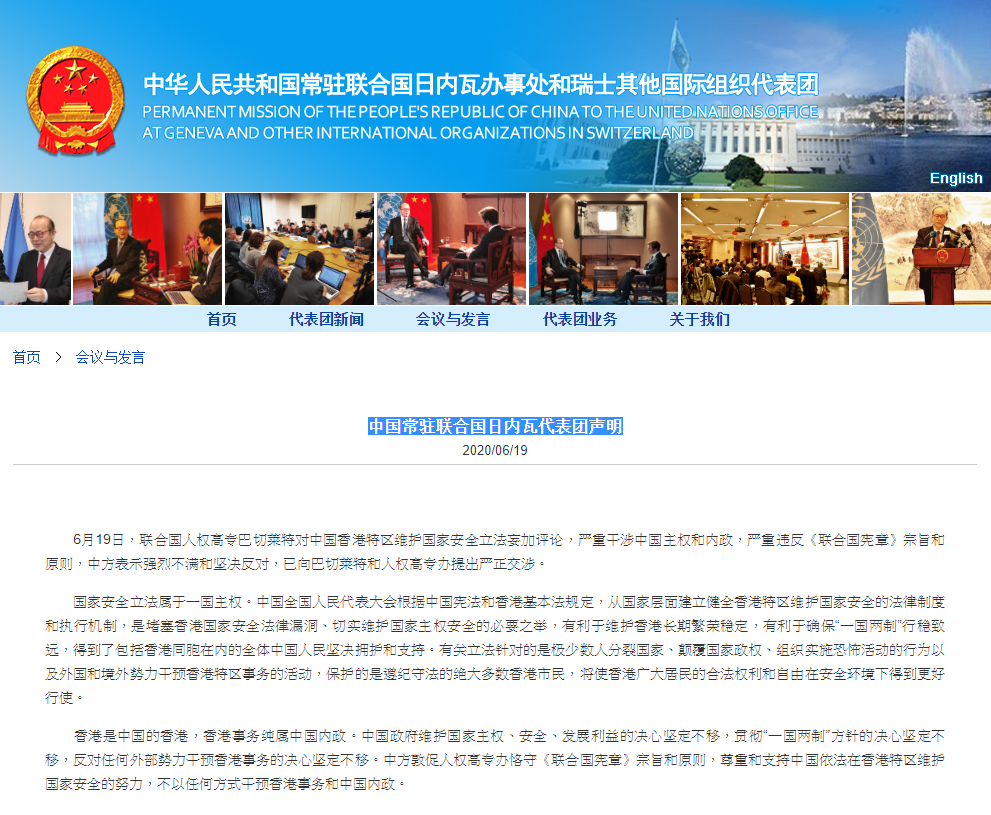 中國常駐聯合國日內瓦代表團於當地時間19日發聲明,批評聯合國人權高級專員巴切萊特,對香港維護國家安全立法妄加評論,嚴重干涉中國主權和內政,嚴重違反《聯合國憲章》宗旨和原則,中方表示強烈不滿和堅決反對,已向巴切萊特和人權高級專員辦事處提出嚴正交涉。聲明指,香港是中國的香港,香港事務純屬中國內政。中國政府維護國家主權、安全、發展利益的決心堅定不移,貫徹「一國兩制」方針的決心堅定不移,反對任何外部勢力干預香港事務的決心堅定不移。
