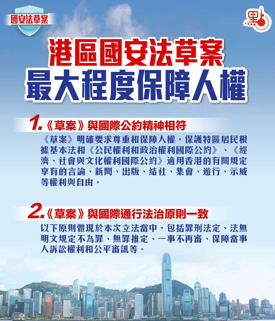 《草案》明確指出,「香港特區維護國家安全應當遵循尊重保障人權等重要法治原則」具體體現在兩個層面,一是與國際公約精神相符,二是與國際通行法治原則一致。