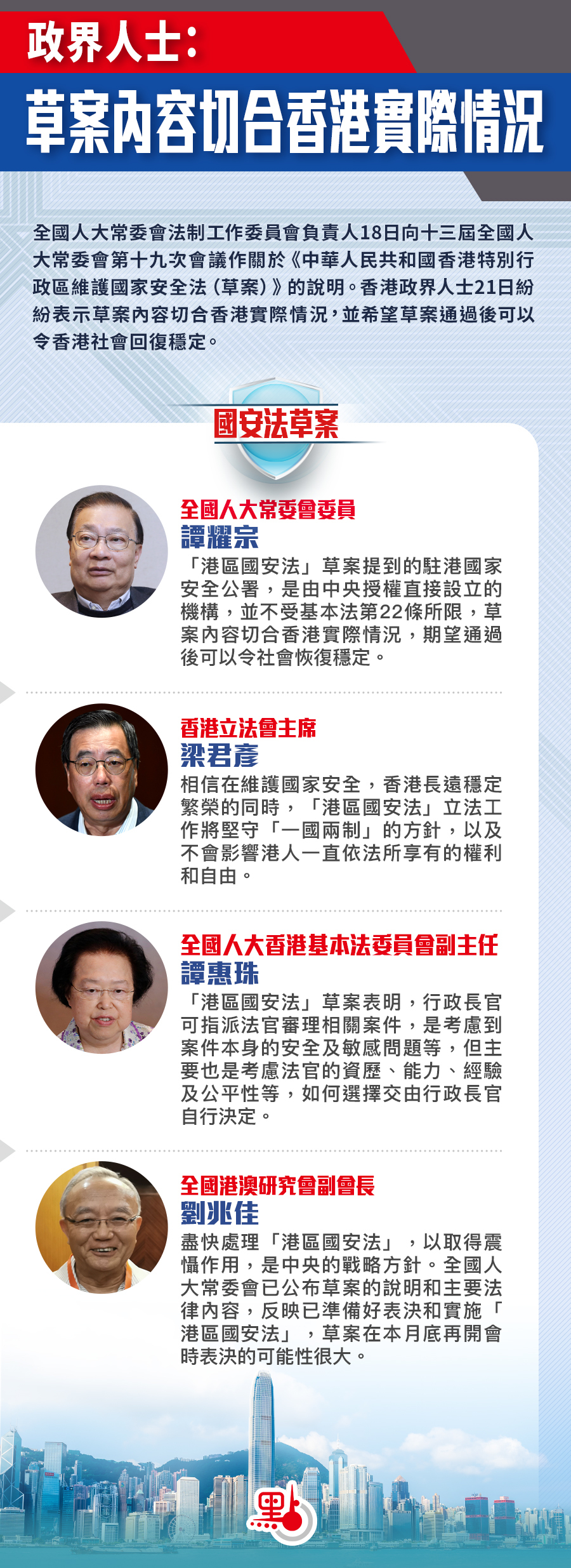全國人大常委會法制工作委員會負責人18日向十三屆全國人大常委會第十九次會議作關於《中華人民共和國香港特別行政區維護國家安全法(草案)》的說明。香港政界人士21日紛紛表示草案內容切合香港實際情況,並希望草案通過後可以令香港社會回復穩定。