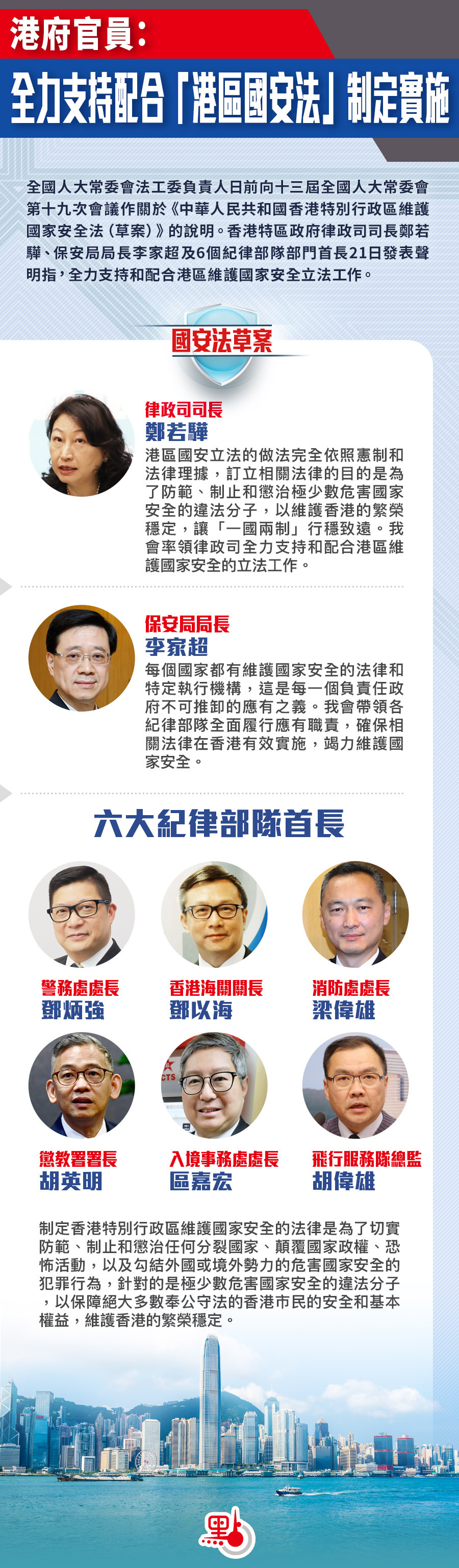 全國人大常委會法工委負責人日前向十三屆全國人大常委會第十九次會議作關於《中華人民共和國香港特別行政區維護國家安全法(草案)》的說明,明確將由香港警務處設立維護國家安全的部門、律政司設立專門的國家安全犯罪案件檢控部門。律政司司長鄭若驊、保安局局長李家超及6個紀律部隊部門首長21日發表聲明指,將全力支持和配合港區維護國家安全立法工作。