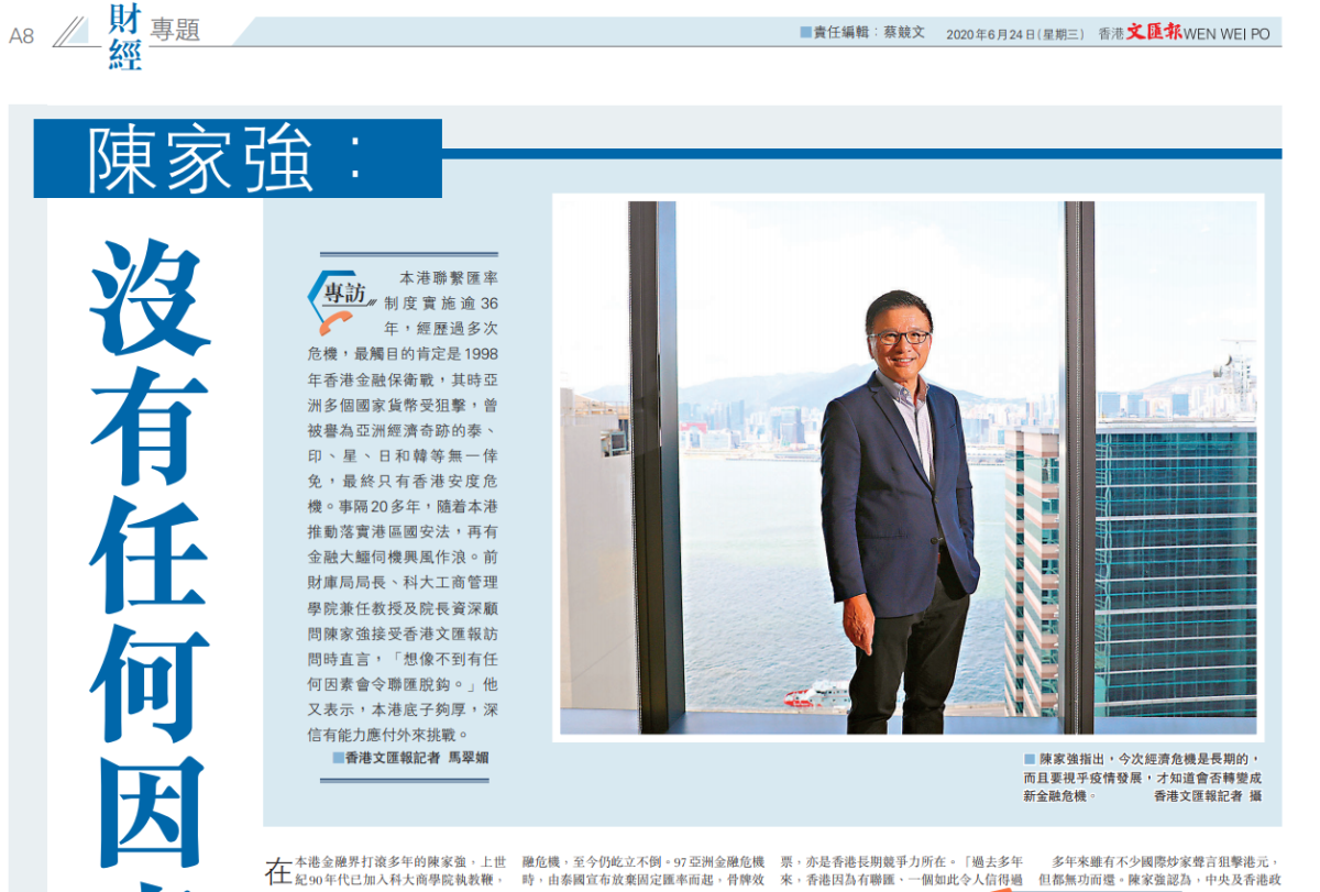 香港港聯繫匯率制度實施逾36年,經歷過多次危機,最觸目的肯定是1998年香港金融保衛戰,其時亞洲多個國家貨幣受狙擊,曾被譽為亞洲經濟奇跡的泰、印、星、日和韓等無一倖免,最終只有香港安度危機。事隔20多年,隨着本港推動落實「港區國安法」,再有金融大鱷伺機興風作浪。前財庫局局長、科大工商管理學院兼任教授及院長資深顧問陳家強如昨日接受香港文匯報訪問時直言,「想像不到有任何因素會令聯匯脫鈎。」他又表示,本港底子夠厚,深信有能力應付外來挑戰。