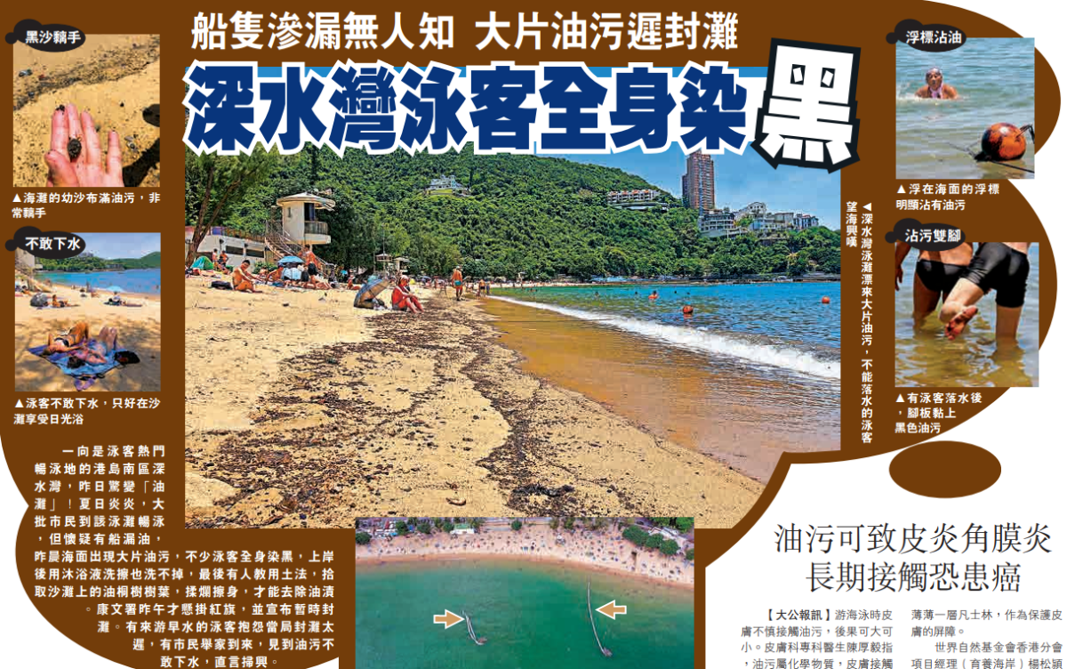 一向是泳客熱門暢泳地的港島南區深水灣,昨日驚變「油灘」!夏日炎炎,大批市民到該泳灘暢泳,但懷疑有船漏油,昨晨海面出現大片油污,不少泳客全身染黑,上岸後用沐浴液洗擦也洗不掉,最後有人教用土法,拾取沙灘上的油桐樹樹葉,揉爛擦身,才能去除油漬。康文署昨午才懸掛紅旗,並宣布暫時封灘。有來游早水的泳客抱怨當局封灘太遲,有市民舉家到來,見到油污不敢下水,直言掃興。