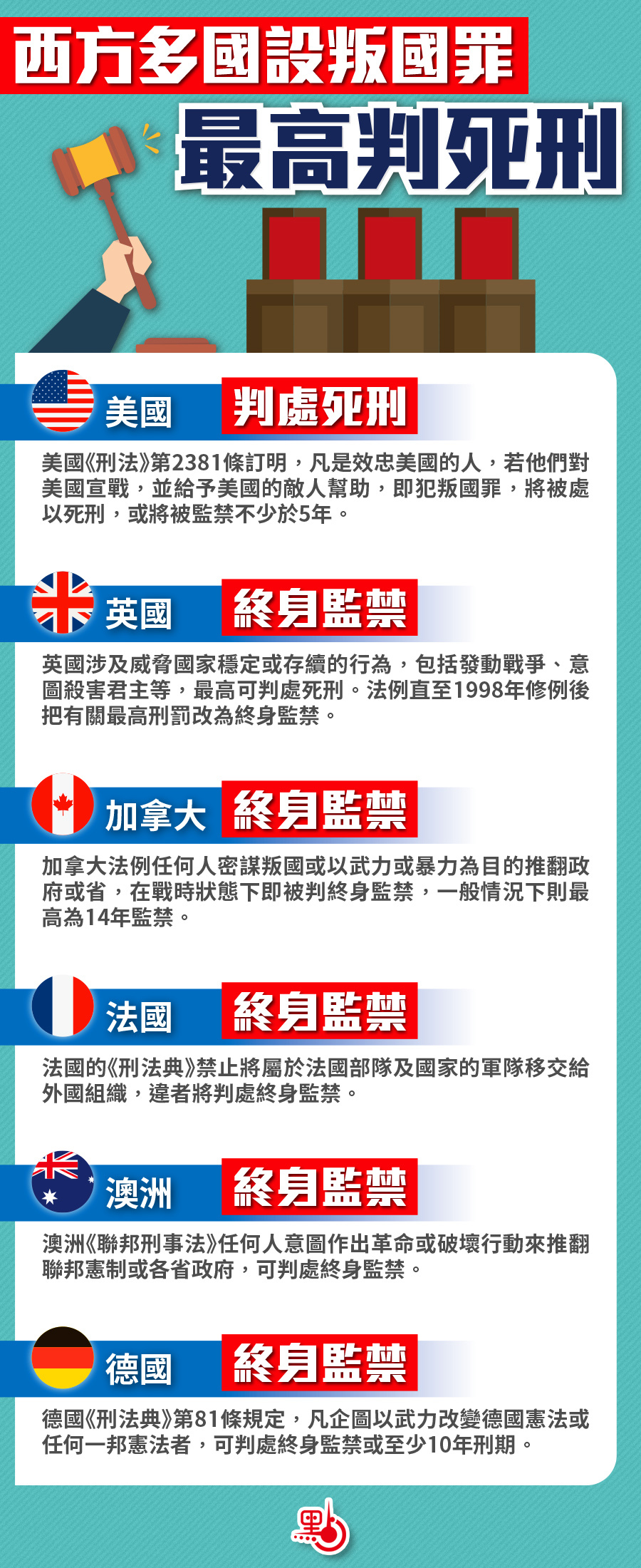全國人大常委會今日(29日)繼續審議港區國安法,據列席會議的港區全國人大代表葉國謙昨日透露,港區國安法將會列明叛國罪處以最高死刑的懲罰。其實,在美國、英國等西方多個國家,都在相關法例中定明嚴懲叛國者,美國最高會判處死刑。英國、法國、德國等國刑罰則一律判處終身監禁。