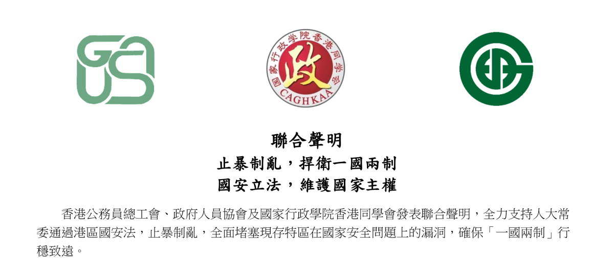 香港公務員總工會、政府人員協會及國家行政學院香港同學會今日(30日)發表聯合聲明,全力支持全國人大常委會通過港區國安法,止暴制亂,全面堵塞現存特區在國家安全問題上的漏洞,確保「一國兩制」行穩致遠。