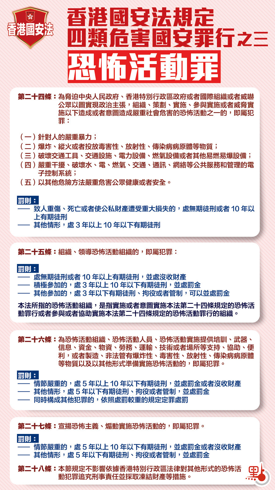 香港國安法明確規定四類危害國家安全的罪行,其中恐怖活動罪是指,為脅迫中央政府、香港特區政府或者國際組織或者威嚇公眾以圖實現政治主張,組織、策劃、實施、參與實施或者威脅實施造成或者意圖造成嚴重社會危害的恐怖活動;為恐怖活動提供培訓、武器、信息、資金、物資、勞務、運輸、技術或者場所等支持、協助、便利,或者製造、非法管有爆炸性、毒害性、放射性、傳染病病原體等物質以及以其他形式準備實施恐怖活動;還包括宣揚恐怖主義、煽動實施恐怖活動。