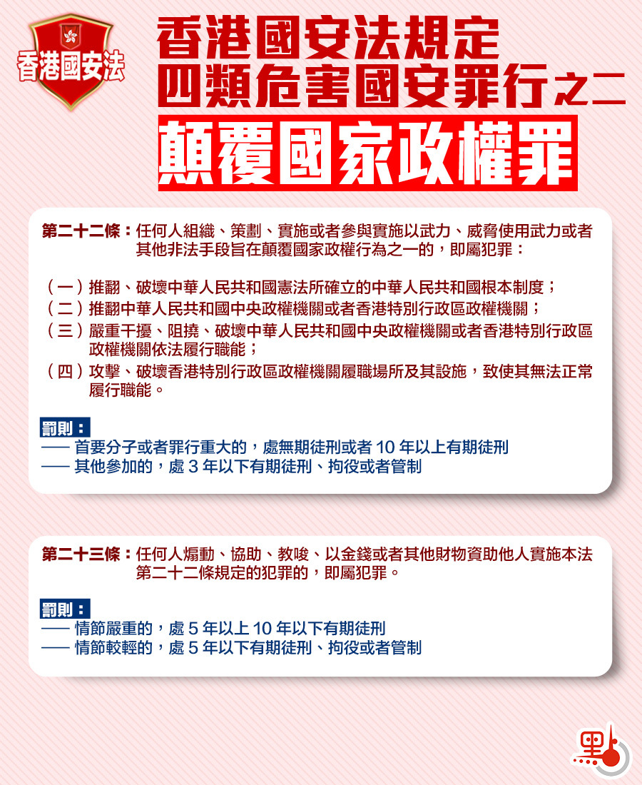 香港國安法已經生效,明確規定分裂國家罪、顛覆國家政權罪、恐怖活動罪、勾結外國或者境外勢力危害國家安全罪四類犯罪行為的具體構成和相應的刑事責任。
