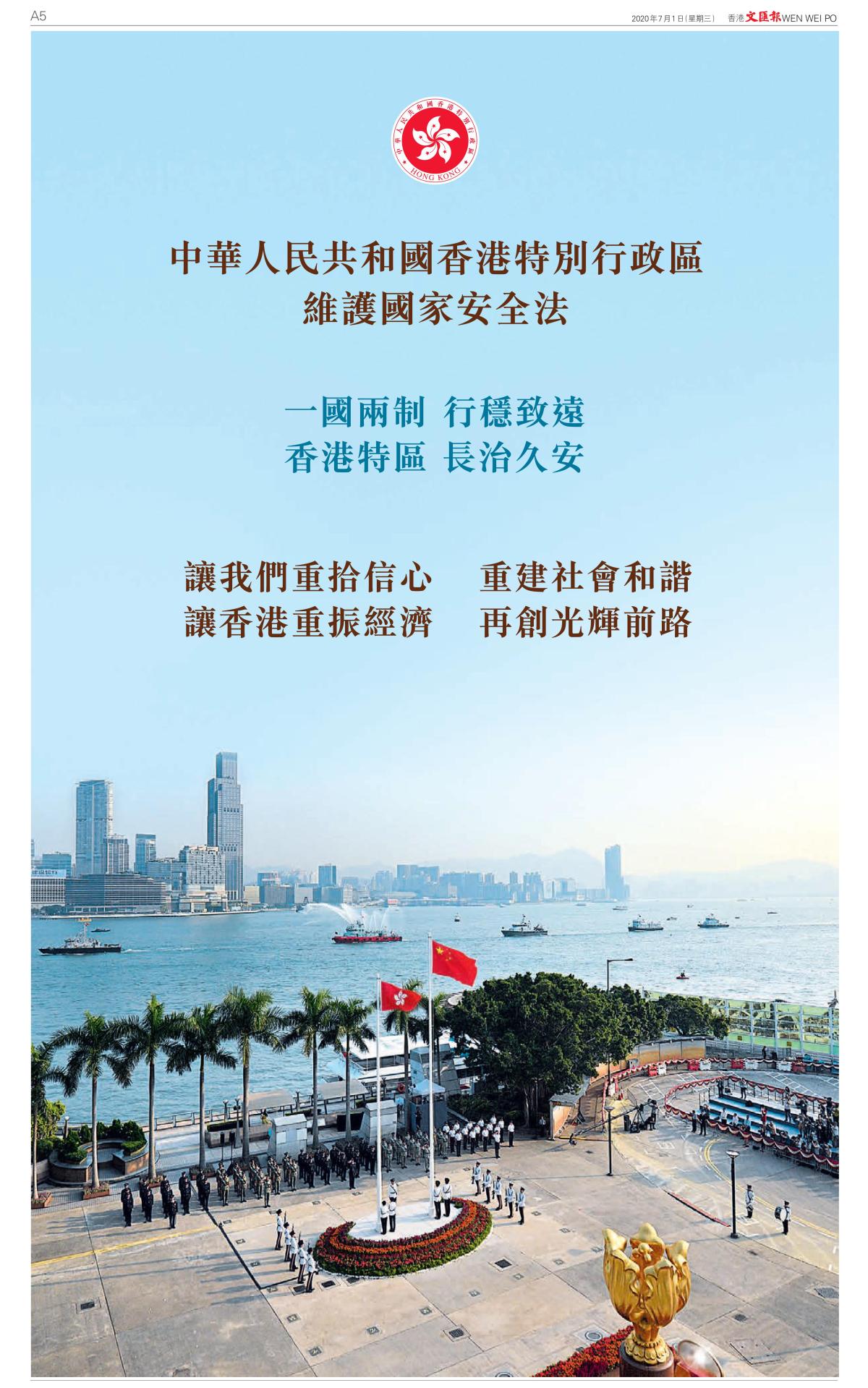 政府在廣告表示,香港國安法可令「一國兩制」行穩致遠,亦令香港特區長治久安。廣告又指,香港國安法可讓香港重拾信心,重建社會和諧;讓香港重振經濟,再創光輝前路。