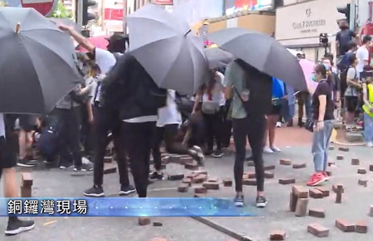 香港警方今日(1日)指,下午約6時半,銅鑼灣波斯富街近時代廣場,有暴徒掘出大量磚頭,扔出馬路。路面布滿磚頭、鐵枝、垃圾及雜物,車輛無法駛進相關街道。警方注意到有人打開雨傘,試圖遮掩違法者的容貌及違法行為。不少市民表示,暴徒掟磚、堵路並縱火無惡不作,期待刊憲實施後的香港國安法盡快發揮「利劍」作用,嚴懲違法犯罪行為,止暴制亂,還香港和平、安寧的社會秩序。