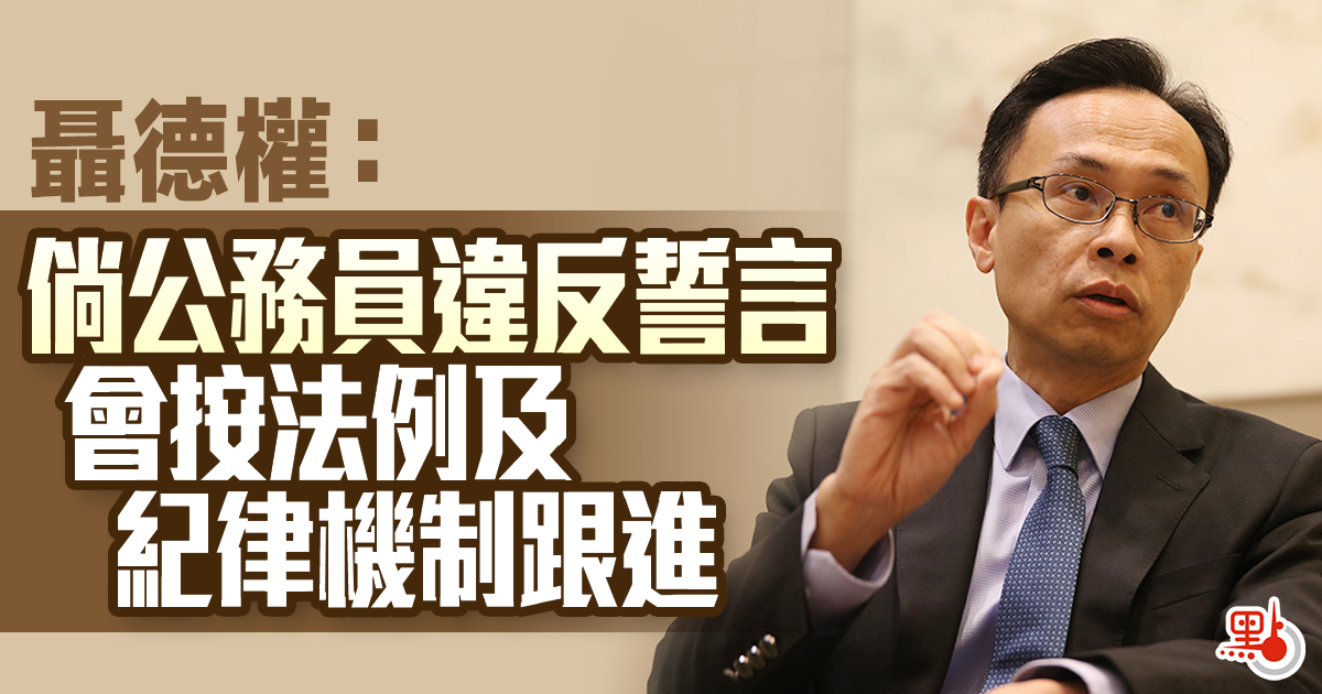 政府提出公務員宣誓建議,公務員事務局局長聶德權今日(10)在立法會一個會議上表示,如果公務員日後違反誓言,例如違反香港國安法及遭判刑,按法律條文會被取消及停止職務;若有其他行為違反誓言,會按相關法例及紀律機制跟進,當局會檢討跟進機制是否有需要加強,以便更快捷跟進。