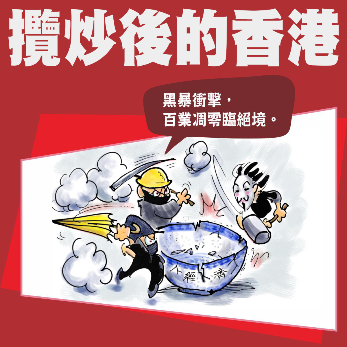 去年以來的黑暴攬炒,給本港帶來了什麼?暴徒在各區聚集搞事,大肆破壞搗亂食肆商店,市民人心惶惶,不敢出街消費,旅遊、零售、餐飲等行業成為重災區。黑暴攬炒已將本港推向危險之境,導致經濟動盪、百業蕭條、失業高企、民不聊生。市民紛紛呼籲,拒絕攬炒,重建家園!