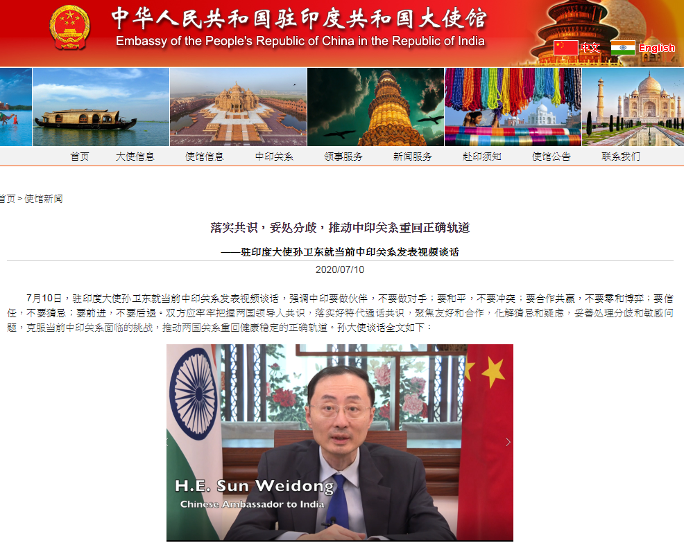 中印關係近月因邊境衝突變得緊張之際,中國駐印度大使孫衛東就當前中印關係發表視頻談話,強調中印要做夥伴,不要做對手;要和平,不要衝突;要合作共贏,不要零和博弈;要信任,不要猜忌;中印關係要前進,不要後退。
