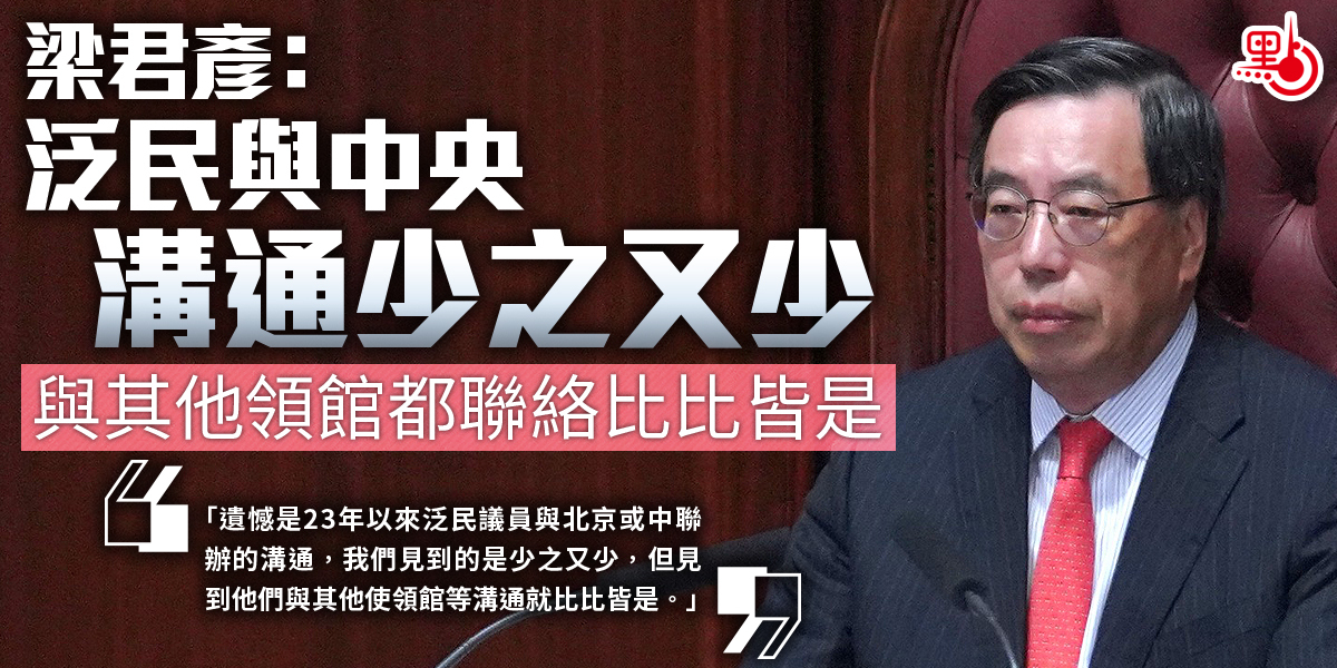 梁君彥遺憾他未能加強議員與中央官員的溝通。梁君彥︰「遺憾是23年以來泛民議員與北京或中聯辦的溝通,我們見到的是少之又少,但見到他們與其他使領館等溝通就比比皆是。」