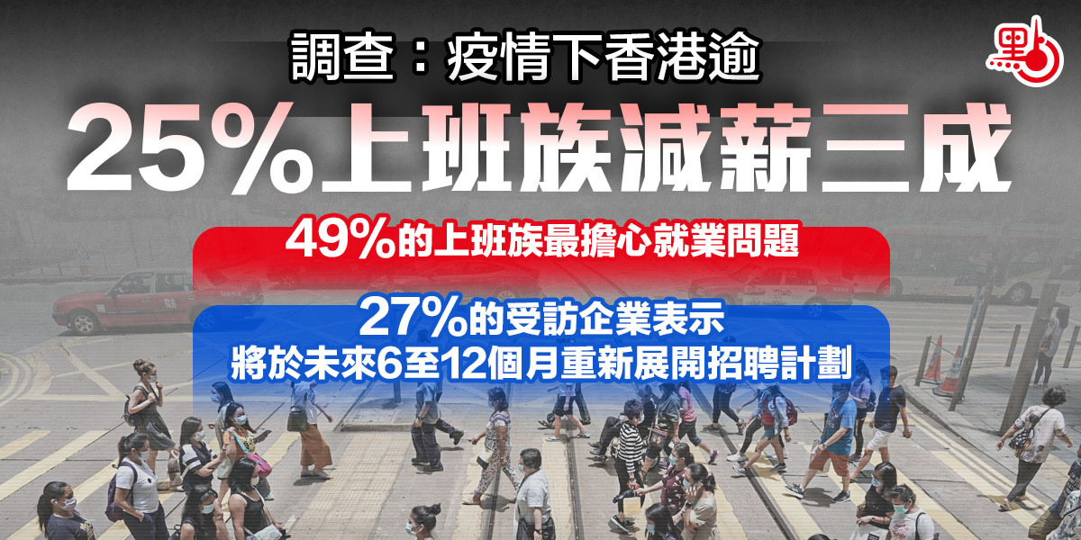 本港新冠肺炎疫情持續,各行各業均受到衝擊。求職網站JobsDB今日(15日)公布的「疫情下職場調查」結果顯示,超過25%的受訪上班族因疫情要減薪最少30%,亦有18%的受訪者要面對裁員及就業機會不足問題。