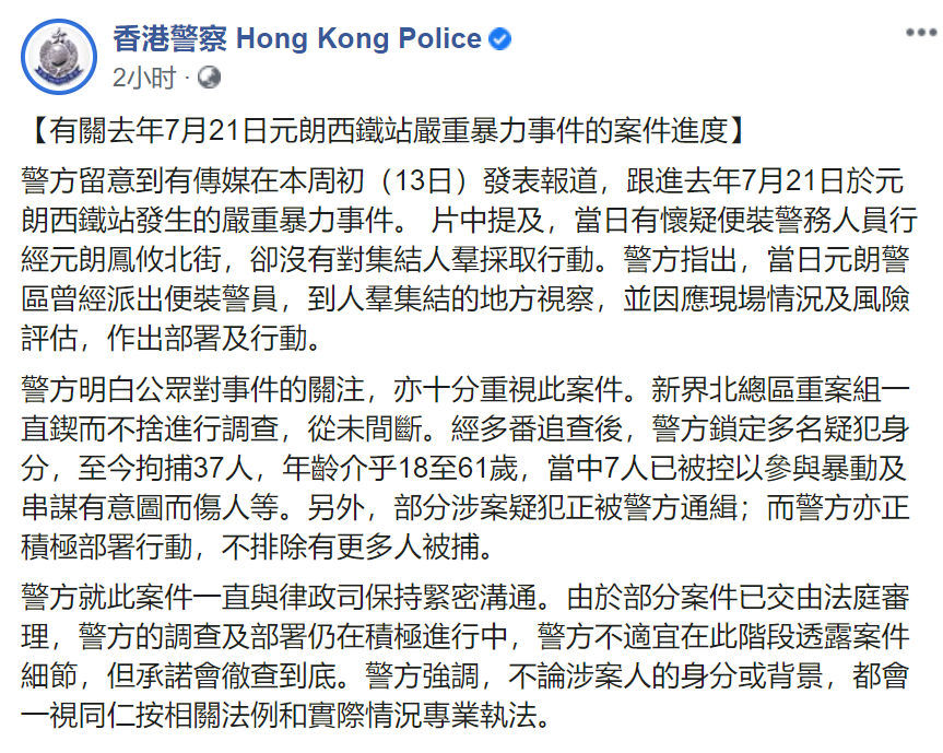 警方表示,明白公眾對事件的關注,亦十分重視此案件。新界北總區重案組一直鍥而不捨進行調查,從未間斷。經多番追查後,警方鎖定多名疑犯身分,至今拘捕37人,年齡介乎18至61歲,當中7人已被控以參與暴動及串謀有意圖而傷人等。另外,部分涉案疑犯正被警方通緝;而警方亦正積極部署行動,不排除有更多人被捕。