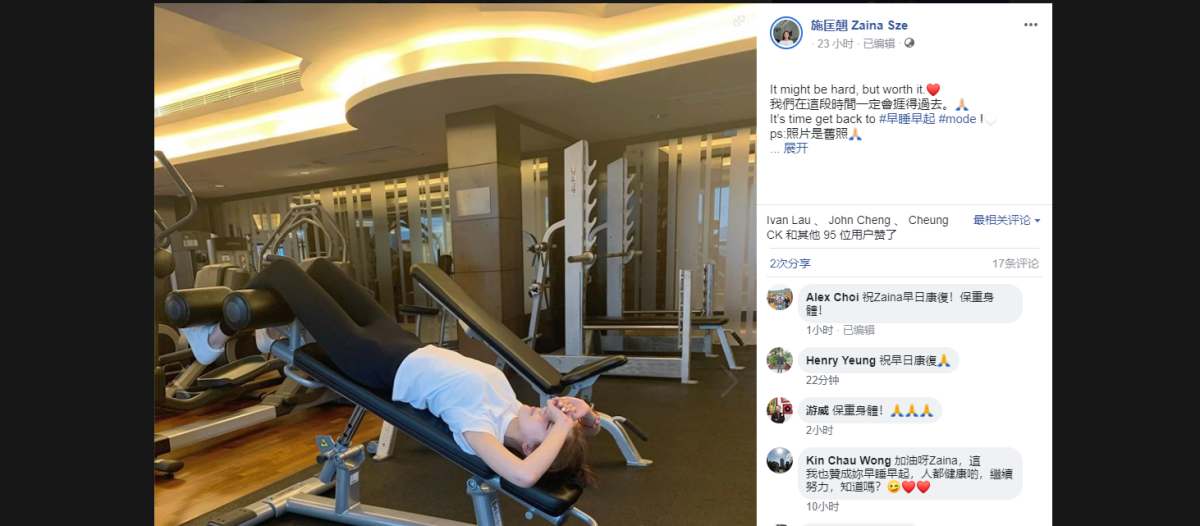 從施匡翹的社交平台所見,昨日還有上載去健身的照片,而她近一周曾與蔣嘉瑩、謝高晉及薛凱琪合照;當中是密切接觸者的蔣嘉瑩和謝高晉已去醫院接受快速測試,而蔣嘉瑩亦帶同兒子和工人姐姐一齊去做測試,暫時未有結果。