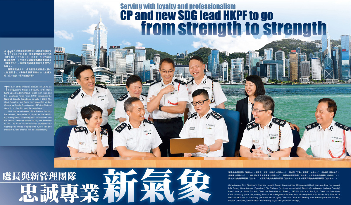 今日出版的《警聲》以跨頁海報介紹新管理團隊,刊有一張警隊高層人員大合照。當中警務處處長鄧炳強坐在前排中央,前排還有3名副處長(行動)蕭澤頤、(管理)郭蔭庶、(國家安全)劉賜蕙,以及人事及訓練處處長李建輝。