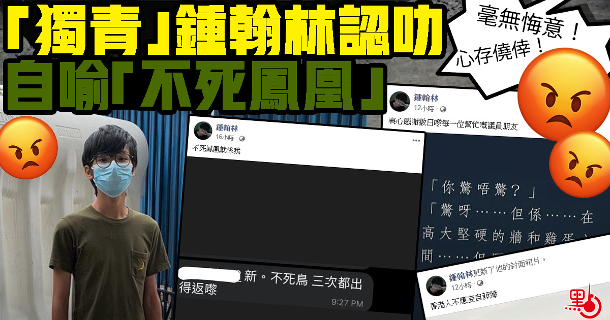 「港獨」組織「學生動源」前召集人鍾翰林及三名前成員,前日被警方國家安全處以涉嫌違反香港國安法拘捕,四人被扣查48小時,昨日下午獲准保釋,8月下旬向警方報到。鍾步出警署時質疑警方拘捕是否「政府操控」,就警方仍未作出起訴,他聲稱「已做好心理準備」。他晚上在社交平台連發三帖,其中一個自喻「不死鳳凰就係我」,顯然是存在僥倖之心。