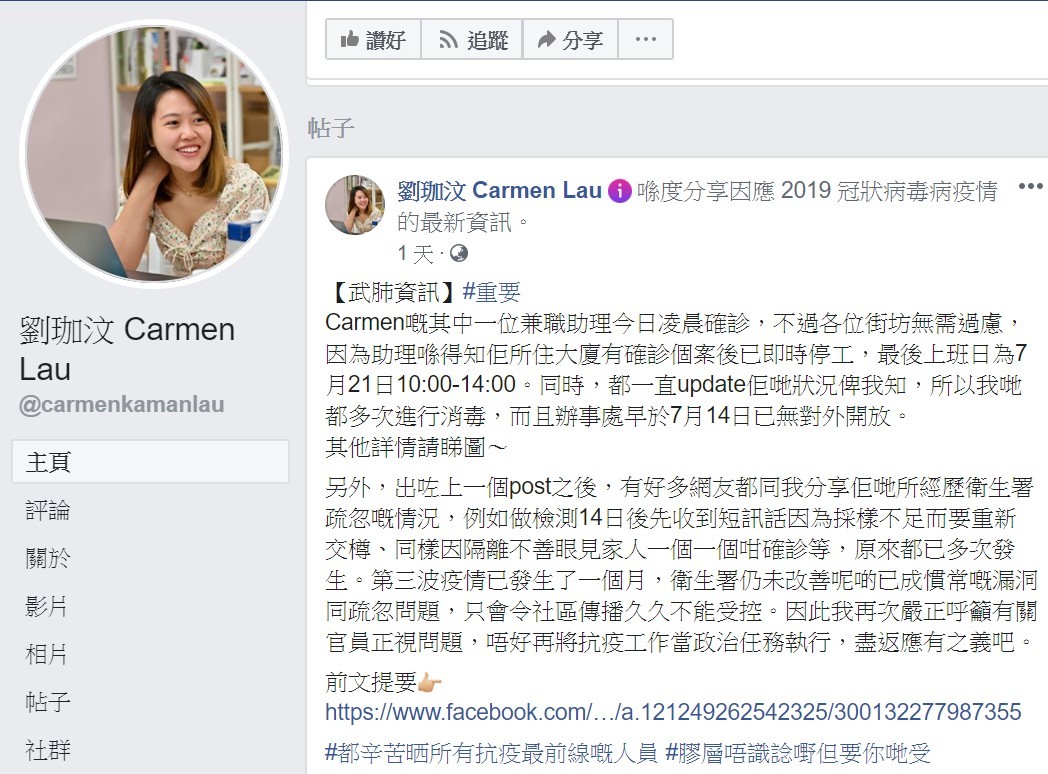 據了解,劉珈汶7月31日在社交平台表示其議員辦事處有一位兼職助理家人確診,及後其助理亦於昨天(1日)凌晨確診,該名助理早前因為所住大廈有確診個案後即時停工,而劉珈汶表示該名最後上班日為7月21日。