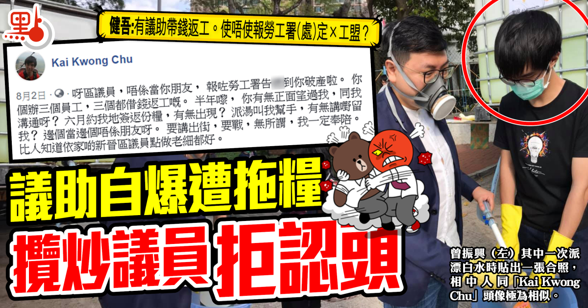 近日一位疑為議員助理嘅網民「Kai Kwong Chu」在fb開post,話自己同其他議辦同事畀人拖糧,又話如果要將件事講出街佢一定奉陪到底,畀市民知道「新晉」區議員點做老闆喎。但有媒體在詢問各方區議員後,都話唔識佢,甚至事主fb有同「屯門社區網絡」區議員曾振興同一個派漂白水活動嘅post,曾振興都話唔識佢。