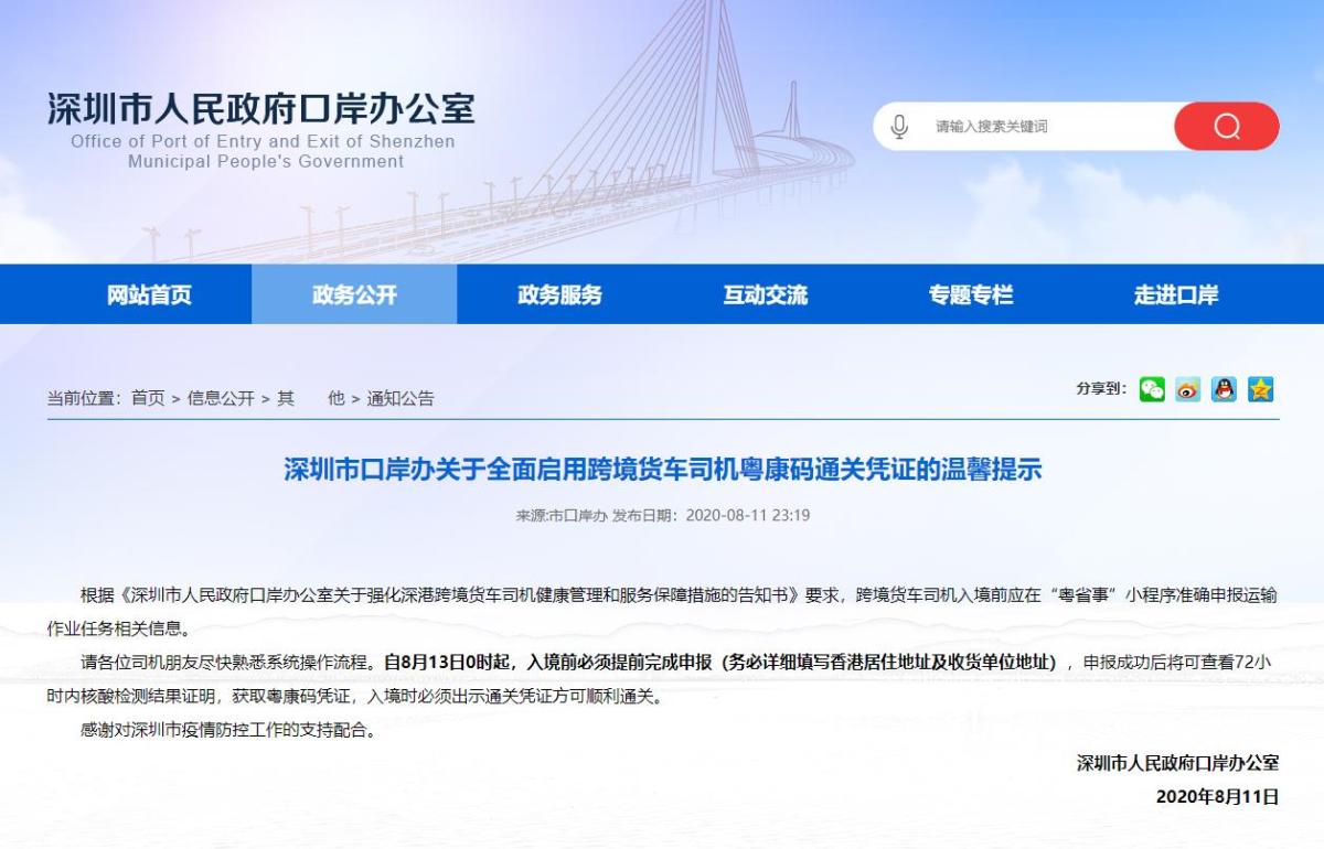 8月11日晚,深圳市口岸辦發布關於全面啟用跨境貨車司機粵康碼通關憑證的最新通報,自8月13日0時起,所有跨境貨車司機入境前必須提前在「粵省事」小程序中完成申報,包括詳細填寫香港居住地址及收貨單位地址等申報運輸作業任務相關信息。申報成功後將可查看72小時內核酸檢測結果證明,獲取粵康碼憑證,入境時必須出示通關憑證方可順利通關。