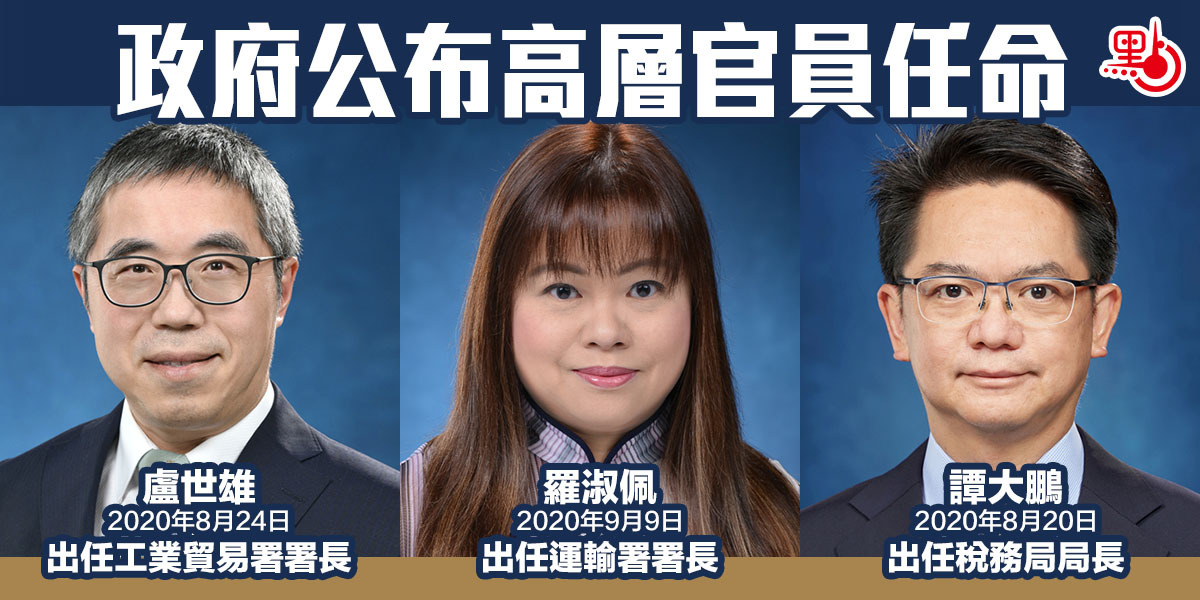 政府今日(13日)宣布高層官員調動,現任公務員事務局副秘書長盧世雄將於今年8月24日出任工業貿易署署長;現任政制及內地事務局副秘書長羅淑佩將於9月9日出任運輸署署長;現任稅務局副局長譚大鵬將於8月20日出任稅務局局長,接替將展開退休前休假的黃權輝。