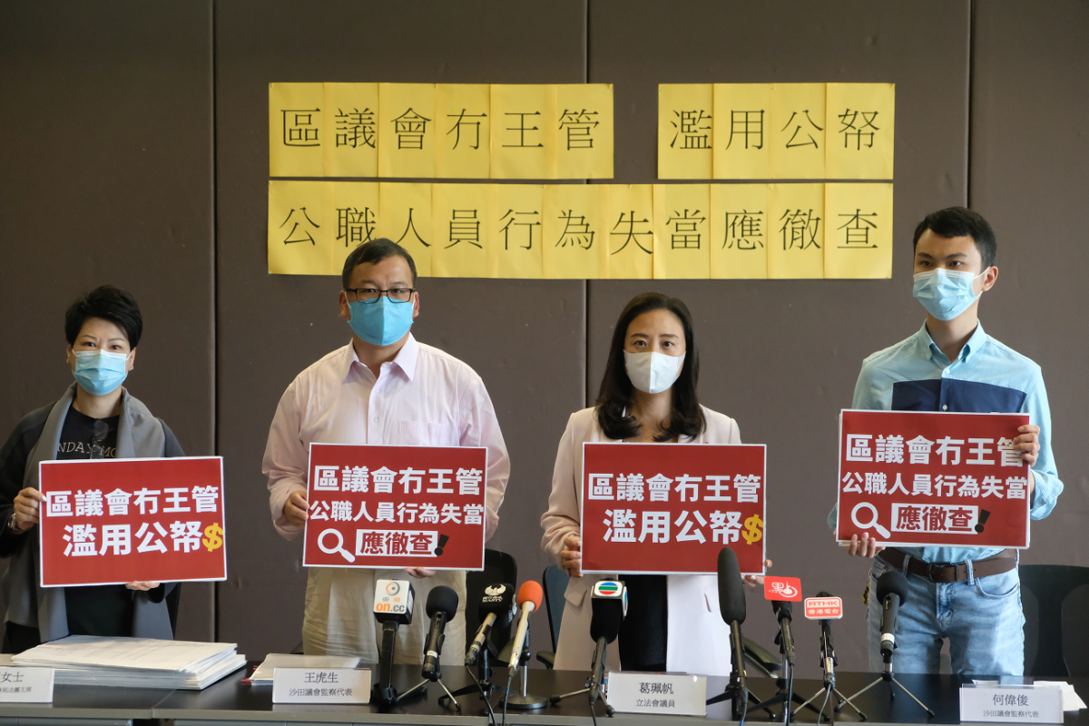 民建聯立法會議員葛珮帆等今日(17日)見傳媒時表示,收到很多「議會監察」的代表和法團的投訴,指多區的區議會在處理撥款的過程中「無王管」,濫用公帑並做「政治審查」,涉嫌公職人員行為失當,並促廉政公署和民政事務局徹查事件。