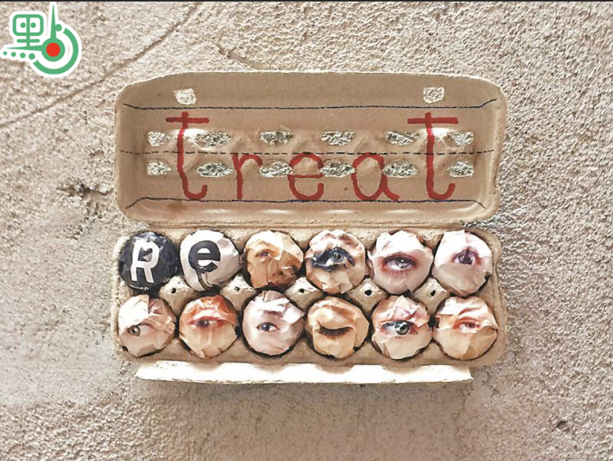 其次,他用遭丟棄的雜誌,撕下10 張不同模特兒的照片,包成雞蛋狀放入雞蛋盒,模特兒其中一隻眼睛向上,看似10 個眼球在雞蛋盒裏,盒上寫着「RETREAT」(改變)。這個作品現時貼在上環永樂街一個垃圾站的牆上。GoHung 指,人的膚色像雞蛋,眼睛有醒覺的含義,因疫情的原因,很多人需居家工作、學習,「當人困喺室內太耐,精神健康會變差,以前嘅戰俘就係咁樣被人折磨變癲」,對於他來說, 「RETREAT」的含義等於Reset(重啟),希望市民可以關注精神健康,趁機規劃以後的路,無論疫情帶來什麼影響, 亦要繼續做喜愛的事。
