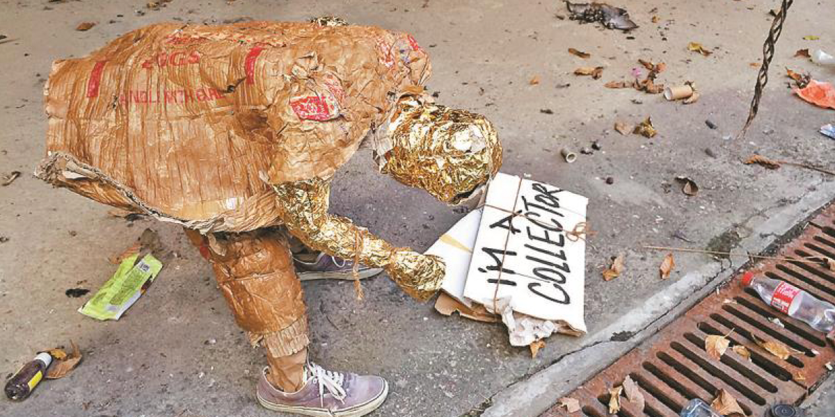 活在物資豐裕的時代,人們往往忽略物品的多重價值。香港街頭雕塑藝術家GoHung質疑他所生活的城市充滿消費主義和單一用途主義,便通過收集「垃圾」將其變成街頭雕塑的方法,警惕市民學會珍惜,懂得重複利用,減少消耗。疫情期間,他製作了三個作品,提醒市民注意衞生、關注久困家中的精神狀態、鼓勵失業人士勿放棄自我。
