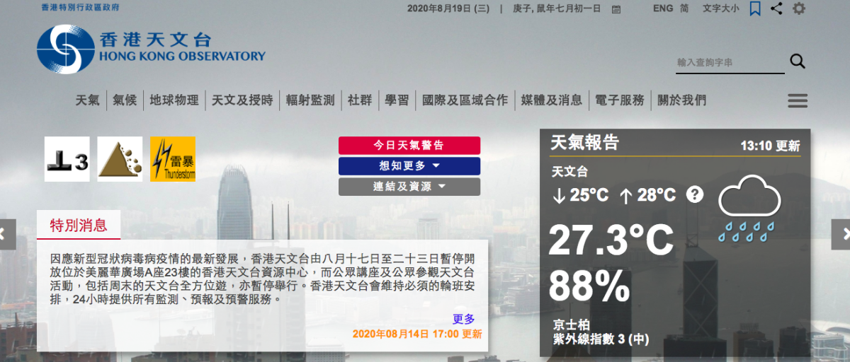 三號強風信號、山泥傾瀉警告和雷暴警告現正生效。天文台表示,本港風力已經普遍減弱,會在短期內取消所有熱帶氣旋警告信號,但提醒市民海面仍有湧浪,應該遠離岸邊及停止所有水上活動。