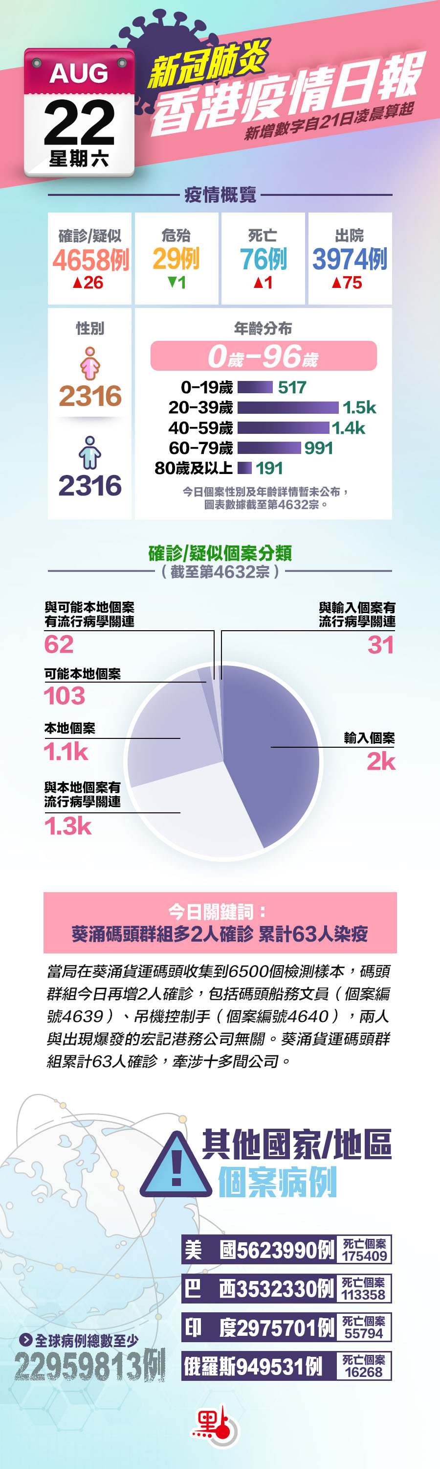 本港今日(22日)新增26宗確診個案,包括24宗本地個案及2宗輸入個案,是連續第20日維持雙位數確診。至今本港累計4657宗確診個案及1宗疑似個案。
