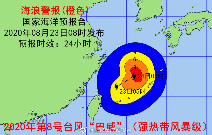 受「巴威」的影響,預計8月23日中午到24日中午,東海東部將出現6到9米的狂浪到狂濤區,東海西部、釣魚島附近海域將出現4到6米的巨浪到狂浪區,近海海浪預警級別為橙色;浙江、上海近岸海域將出現2到3米的中浪到大浪,近岸海域海浪預警級別為藍色。