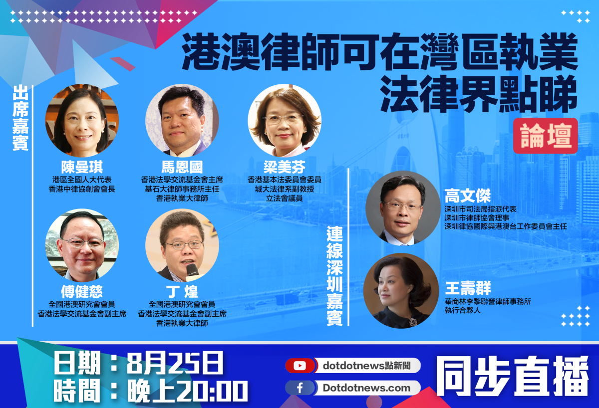 由點新聞舉辦的「港澳律師可在灣區執業 法律界點睇」論壇,將於8月25日(周二)晚8點開播。論壇邀請了5位香港法律界專業人士(陳曼琪、馬恩國、梁美芬、傅健慈、丁煌),並會跨境連線深圳市司法局代表高文傑及粵港聯營律師事務所合夥人王壽群,圍繞港澳律師北上灣區執業的熱門問題進行深入討論。