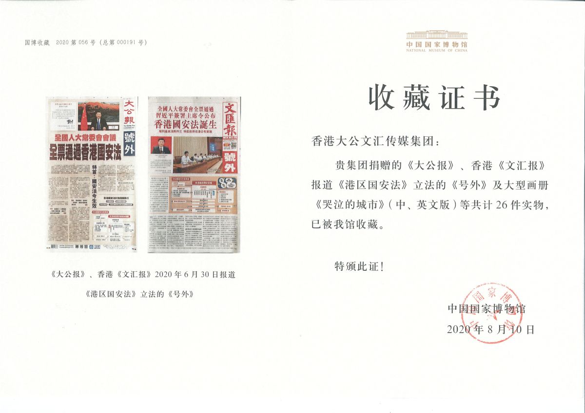 近日,中國國家博物館向香港大公文匯傳媒集團頒授收藏證書,正式永久收藏《大公報》和香港《文匯報》報道香港國安法立法的《號外》及大型畫冊《哭泣的城市--香港修例風波實錄》(中、英文版)等共26件實物(其中5月22日《大公報》號外6件,香港《文匯報》號外6件;6月30日《大公報》號外6件,香港《文匯報》號外6件;中、英文版大型畫冊《哭泣的城市--香港修例風波實錄》各1件)。