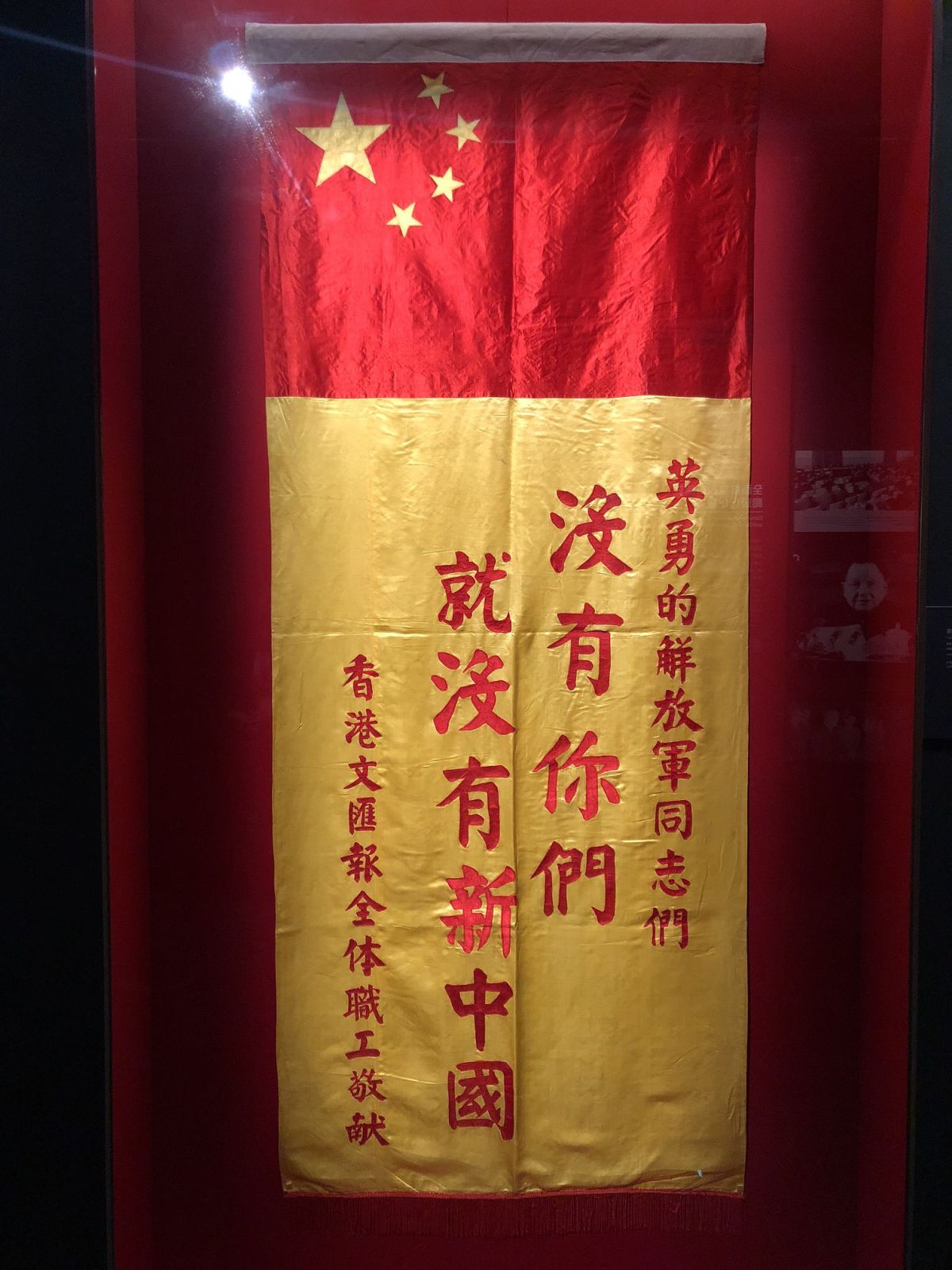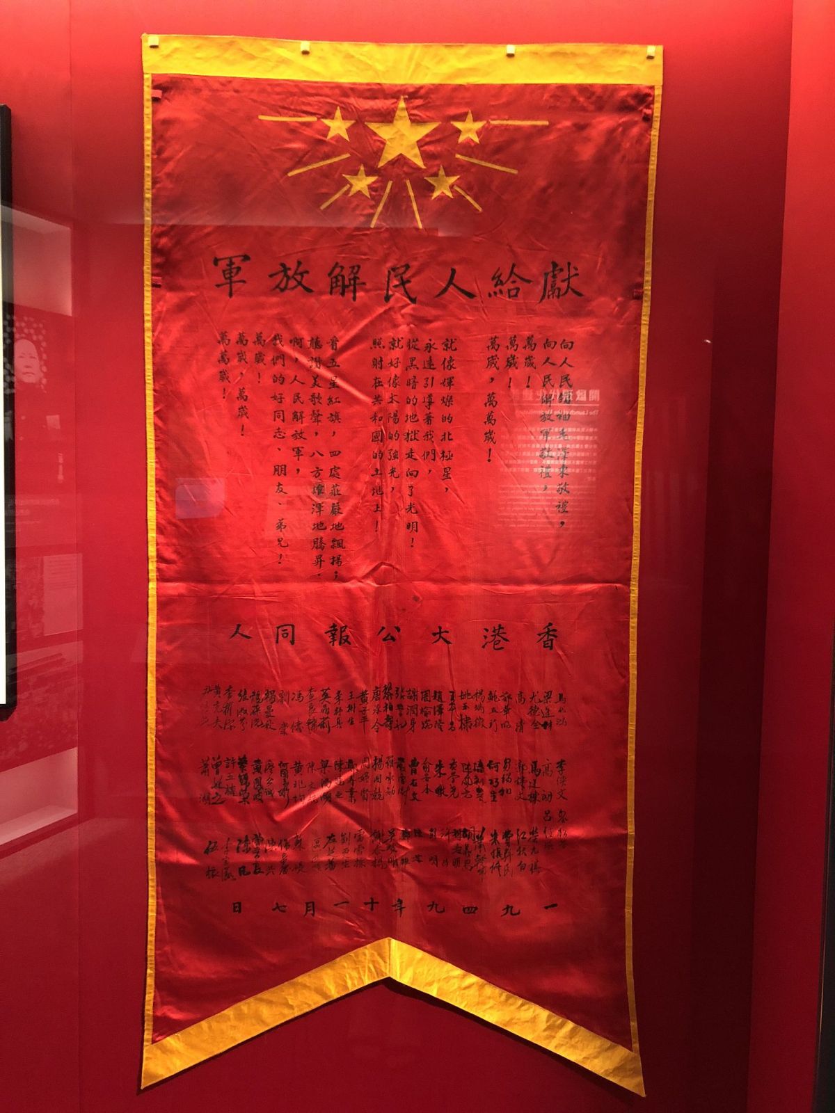 在《大公報》贈送給人民解放軍的錦旗上,《大公報》同仁向人民領袖毛澤東和人民解放軍敬禮,並寫道:「就像輝燦的北極星,永遠引導着我們,從黑暗的地獄走向了光明!就好像太陽的強光,照射在共和國的土地上!」錦旗將人民解放軍稱為「我們的好同志、朋友、弟兄」,表達對人民解放軍的熱切情感。錦旗的下方是香港《大公報》費彝民、李俠文、陳文統、查良鏞、曾敏之、趙澤隆、馬廷棟等的簽名。書寫時間為1949年11月7日。香港《文匯報》全體職工致送給人民解放軍的錦旗,上方是鮮豔的五星紅旗。錦旗上寫道:「沒有你們,就沒有新中國。」
