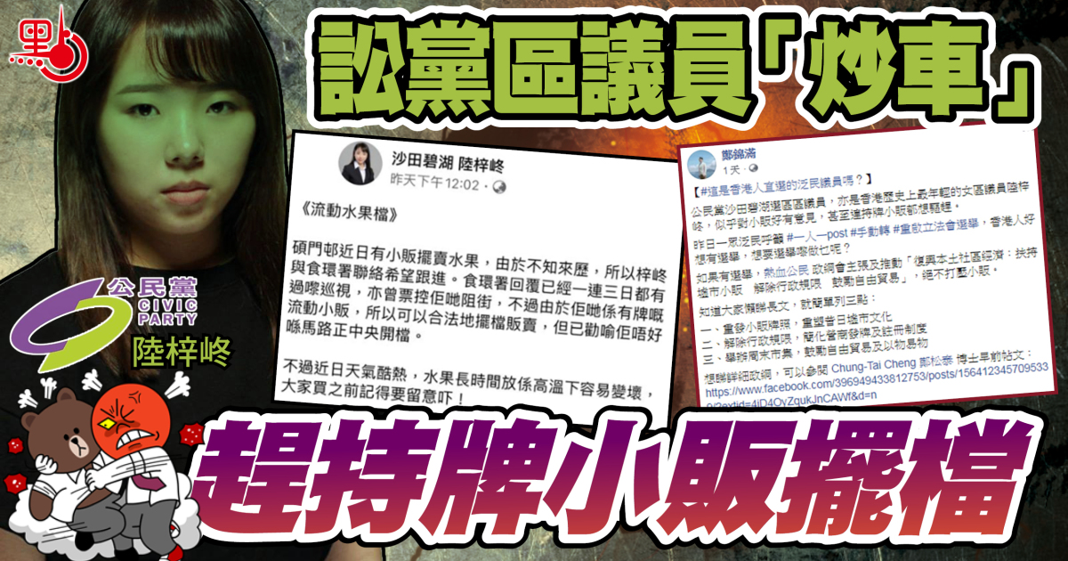 公民黨沙田區議員陸梓峂昨日(27日)在 facebook炫耀「政績」,表示留意到有「不明來歷」嘅小販喺區內擺檔賣水果,於是向食環署舉報,點知對方原來有合法擺檔嘅流動小販牌,結果陸梓峂仲要跌落地揦番揸沙話,雖然可以合法擺檔,但就唔應該喺馬路中央開檔,又話近日天氣酷熱,水果長時間喺高溫下好易變壞,奉勸大家幫襯前要「記得留意」。