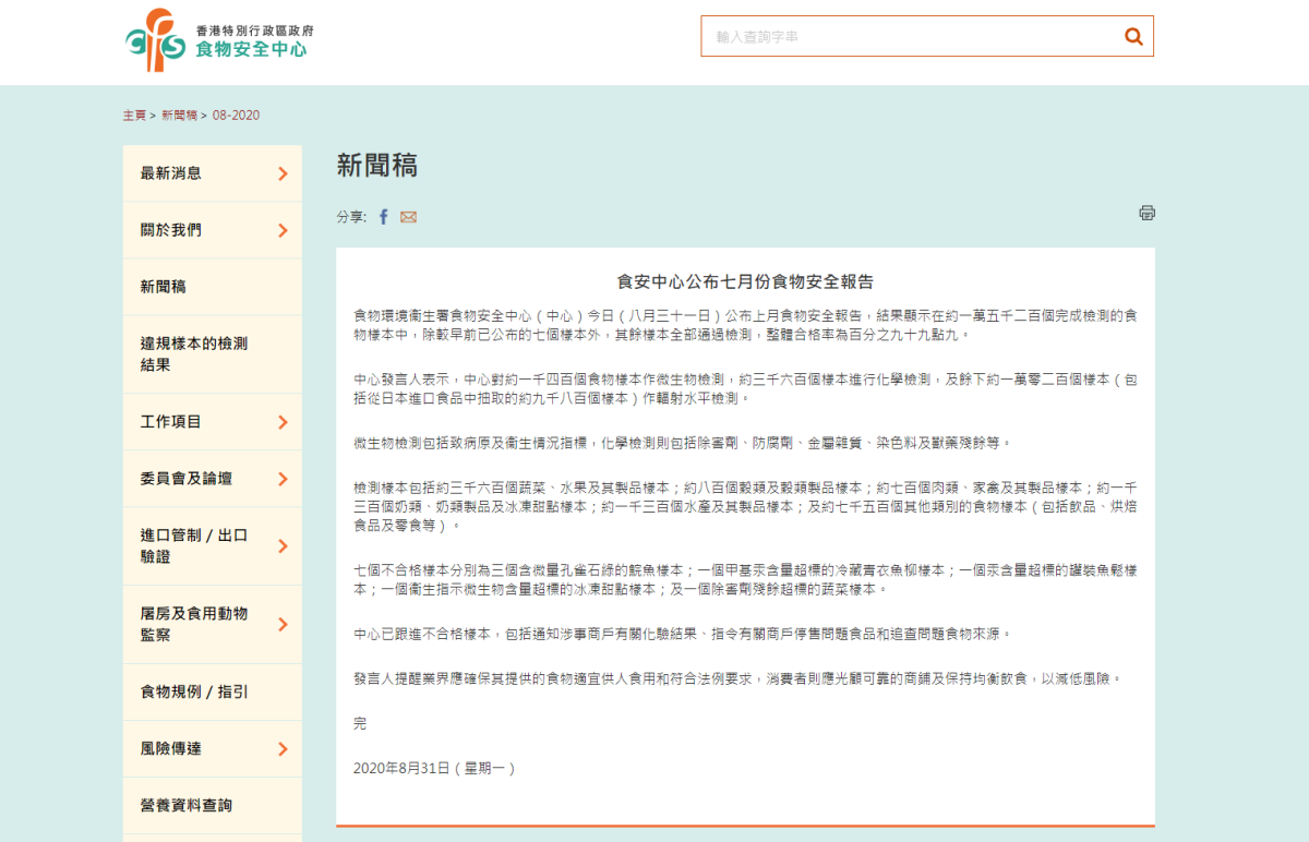 食物環境衞生署食物安全中心今日(31日)公布7月食物安全報告,結果顯示在約15200個完成檢測的食物樣本中,除較早前已公布的7個樣本外,其餘樣本全部通過檢測,整體合格率為99.9%。