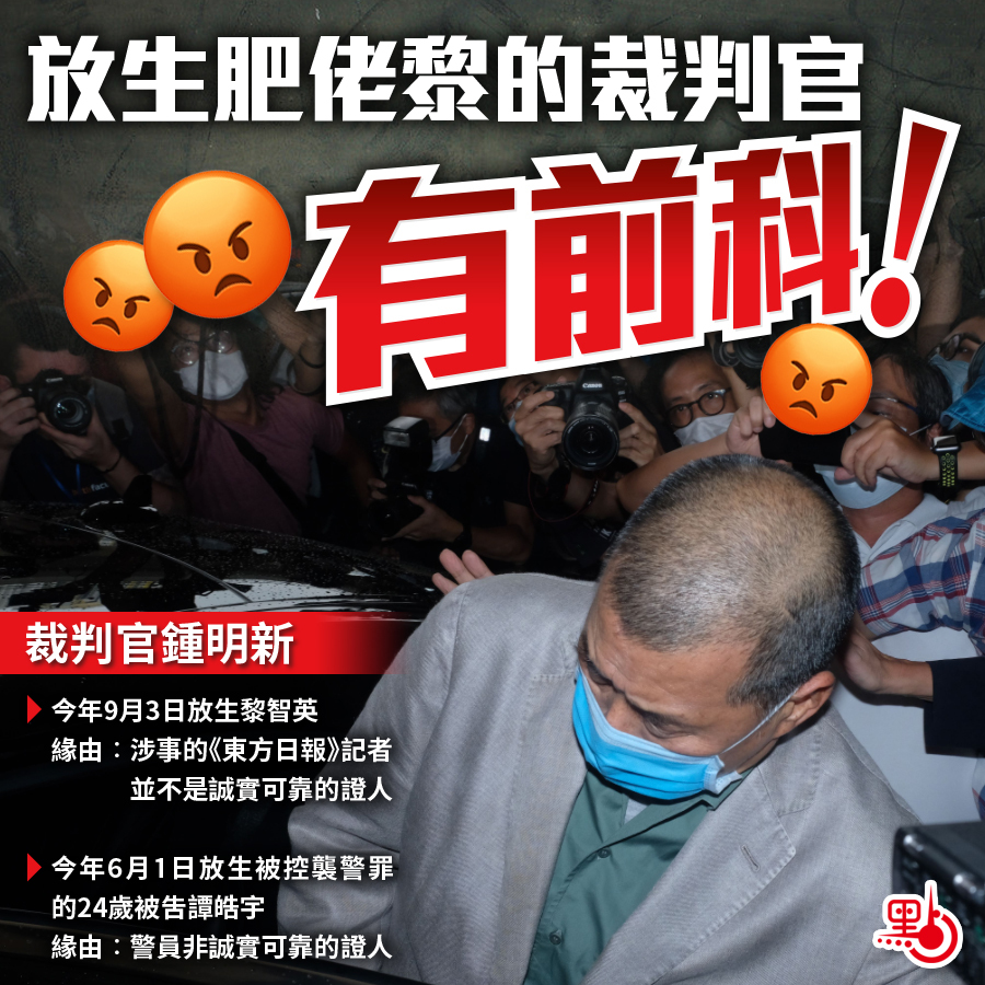 亂港頭目、壹傳媒創辦人黎智英(肥佬黎)2017年涉嫌於維園刑事恐嚇《東方日報》記者,律政司一拖三年後才檢控。雖然證據確鑿,且黎智英早前被裁定刑事恐嚇罪表證成立,但西九龍法院裁判官鍾明新今日(3日)卻裁定,黎智英刑恐罪罪名不成立,即黎智英被放生。多位市民對裁決感到失望,呼籲律政司研究判詞考慮上訴。有學者指出,「今天(黎智英被放生)是對司法極度失望的一天!」