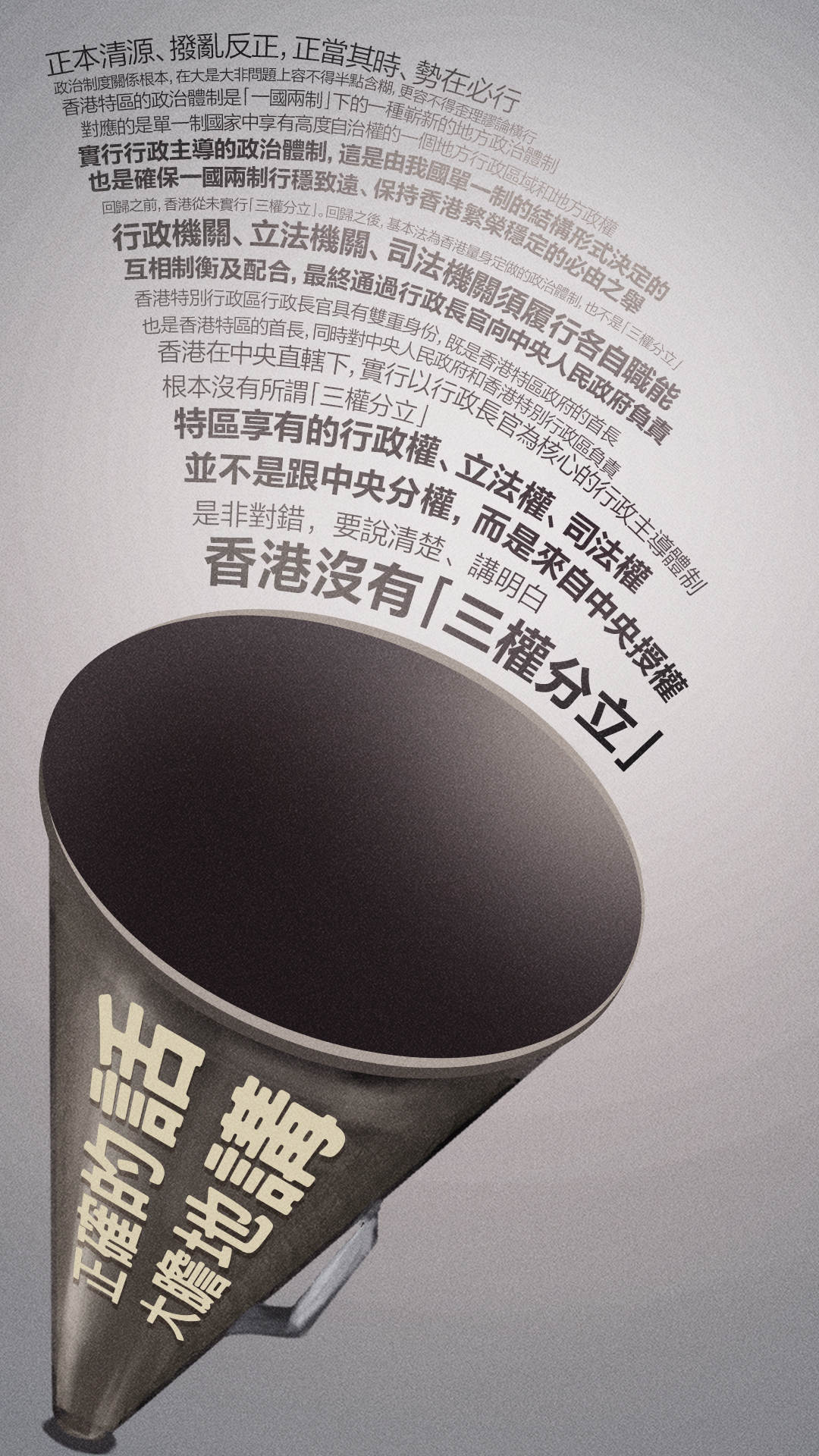 香港「反對派」散播似是而非的言論,刻意歪曲基本法原意,以「三權分立」旗號誤導市民,無非是想阻撓特區政府施政,架空行政長官權力,進而否定中央對香港的管治權。藉著這面旗子,「攬炒派」不惜把原本咨詢性質的區議會變成政治惡鬥的平台,在立法會大搞「拉布」「騎劫」,險惡用心路人皆知。現在,到了講清楚事實,揭掉他們醜惡「畫皮」的時候了。