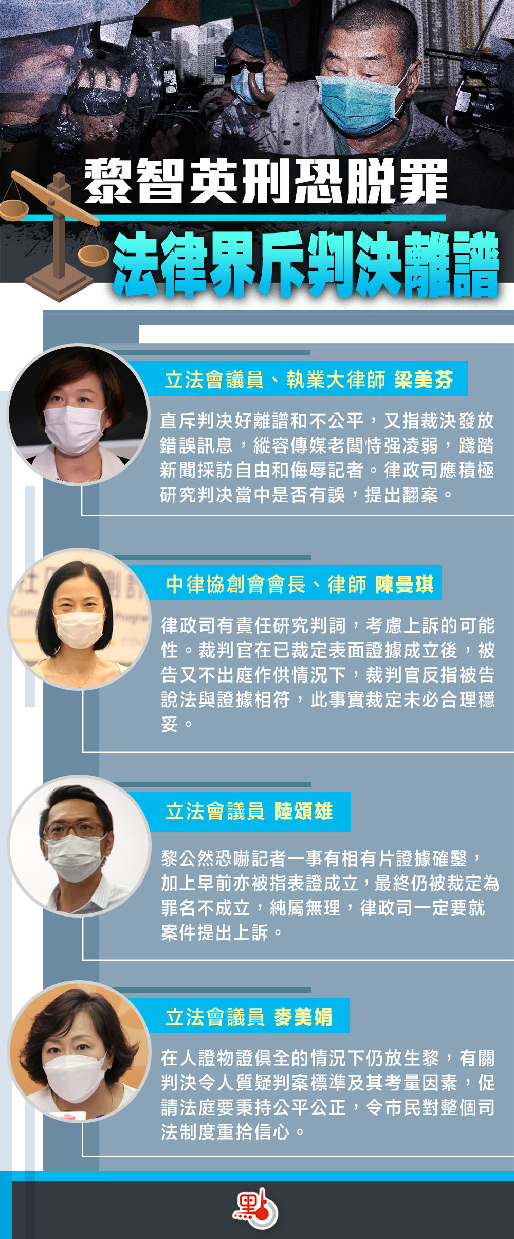 壹傳媒黎智英涉恐嚇記者案昨日竟然在行使恐嚇表證成立的情況下被判罪名不成立,有議員和法律界人士今日(4日)表示,對裁決結果感到詫異和憤怒,炮轟判決不公正,質疑法官處理證人供詞主觀,以及黎智英背後是否有勢力作其「保護傘」,促請律政司務必就案件上訴,以正視聽,以維護社會公義。